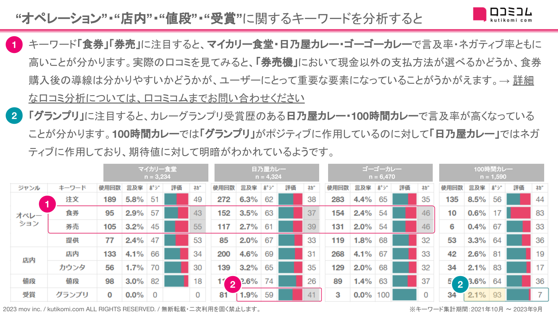 キーワード「食券」「券売」に注目すると、マイカリー食堂・日乃屋カレー・ゴーゴーカレーで言及率・ネガティブ率ともに高いことが分かります。実際の口コミを見てみると、「券売機」において現金以外の支払方法が選べるかどうか、食券購入後の導線は分かりやすいかどうかが、ユーザーにとって重要な要素になっていることがうかがえます。→ 詳細な口コミ分析については、口コミコムまでお問い合わせください。