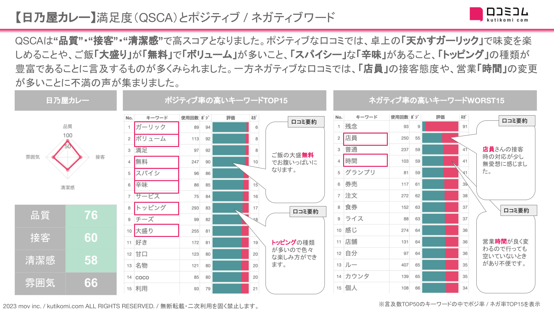 今回は、このAI解析を用いて【日乃屋カレー】 のQSCA・ポジ / ネガキーワードを確認しました。