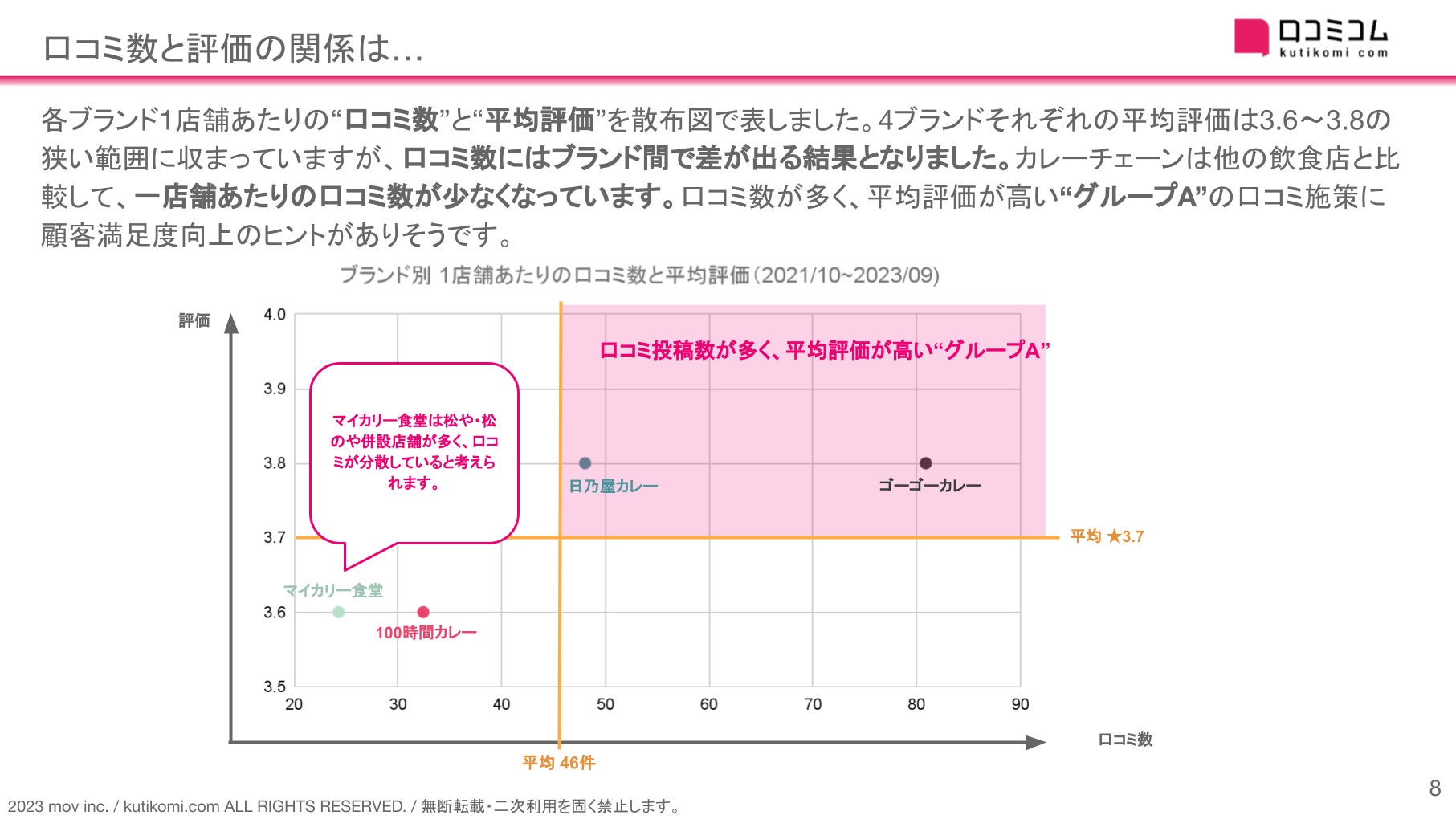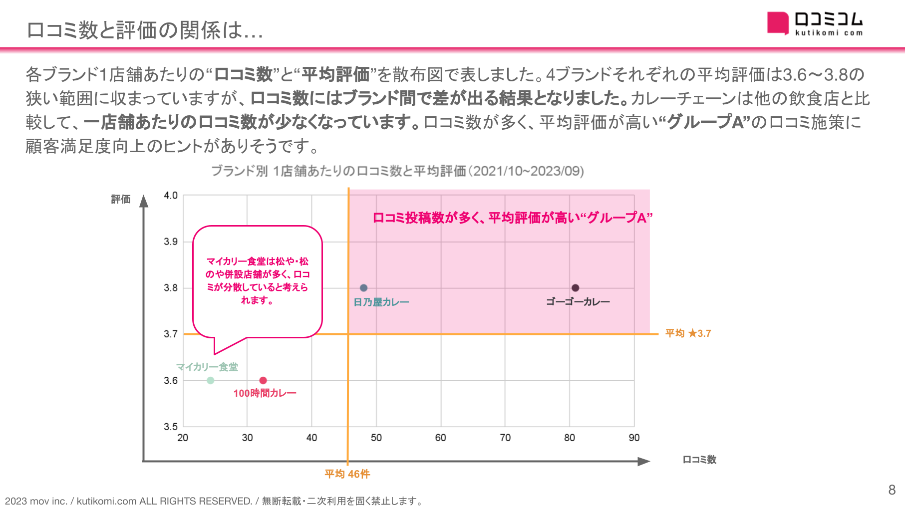 各ブランド1店舗あたりの“口コミ数”と“平均評価”を散布図で表しました。4ブランドそれぞれの平均評価は3.6~3.8の狭い範囲に収まっていますが、口コミ数にはブランド間で差が出る結果となりました。カレーチェーンは他の飲食店と比較して、一店舗あたりの口コミ数が少なくなっています。