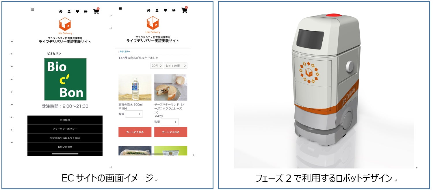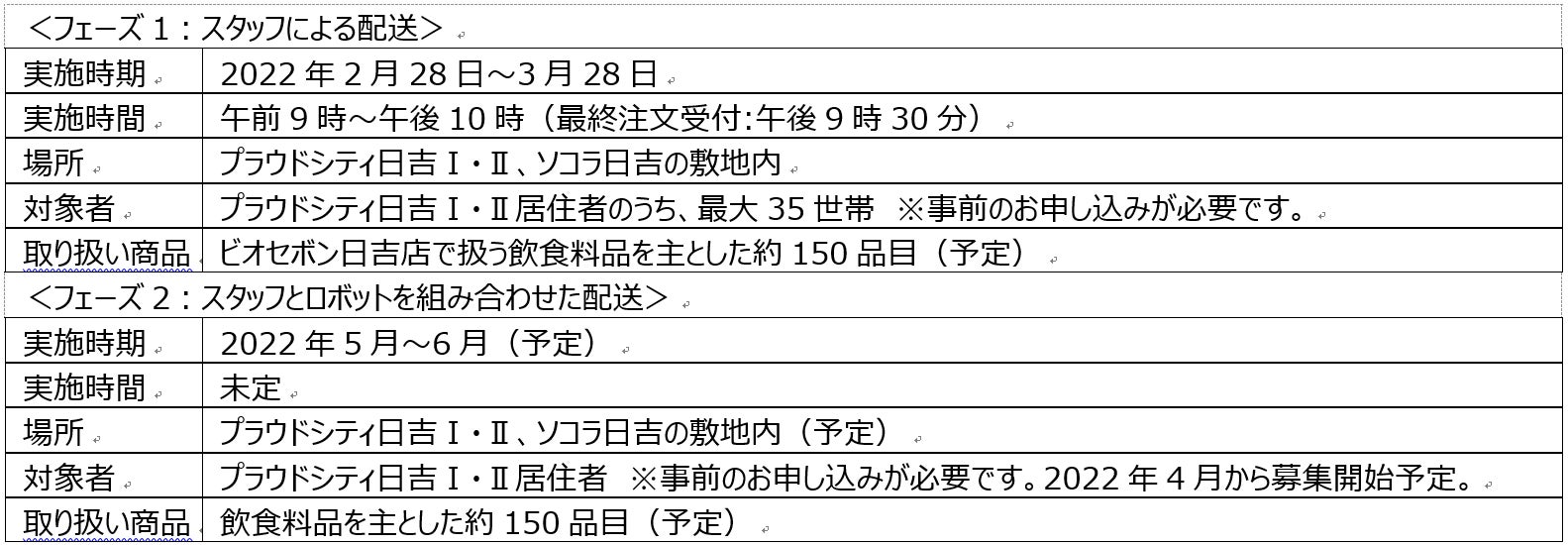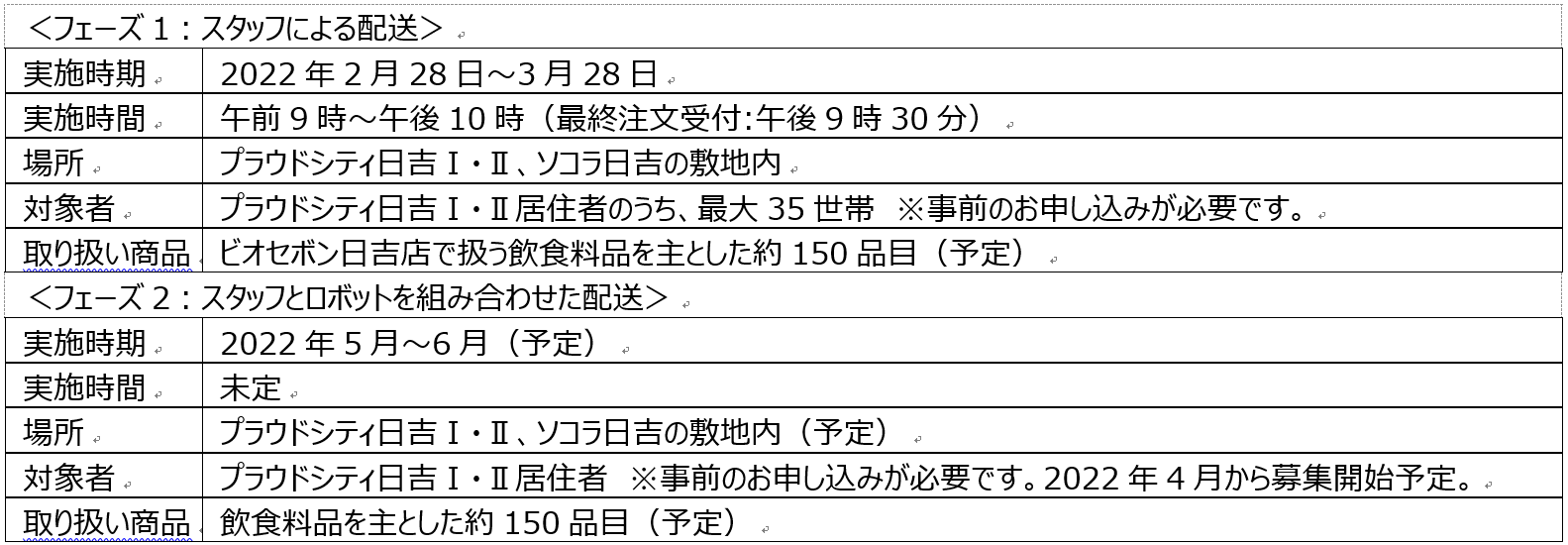 本実証実験は、プラウドシティ日吉居住者を対象として行います。対象者が街区内にある地域密着型商業施設ソコラ日吉内の店舗で取り扱う商品を実験用ECサイトから購入すると、その商品は、配送スタッフまたは配送ロボットにより各階または各住戸まで届けられます。安価な配送料金設定と、専属スタッフまたはロボットを組み合わせた配送により、1品からでも気兼ねなく注文ができる仕様を構築し、飲食料品の予期せぬ不足、忙しい朝食夜食時の総菜・おつまみの追加など、いざというときに頼れるちょっと便利な解決手法を提供します。これにより、新しいライフスタイルを提案します。