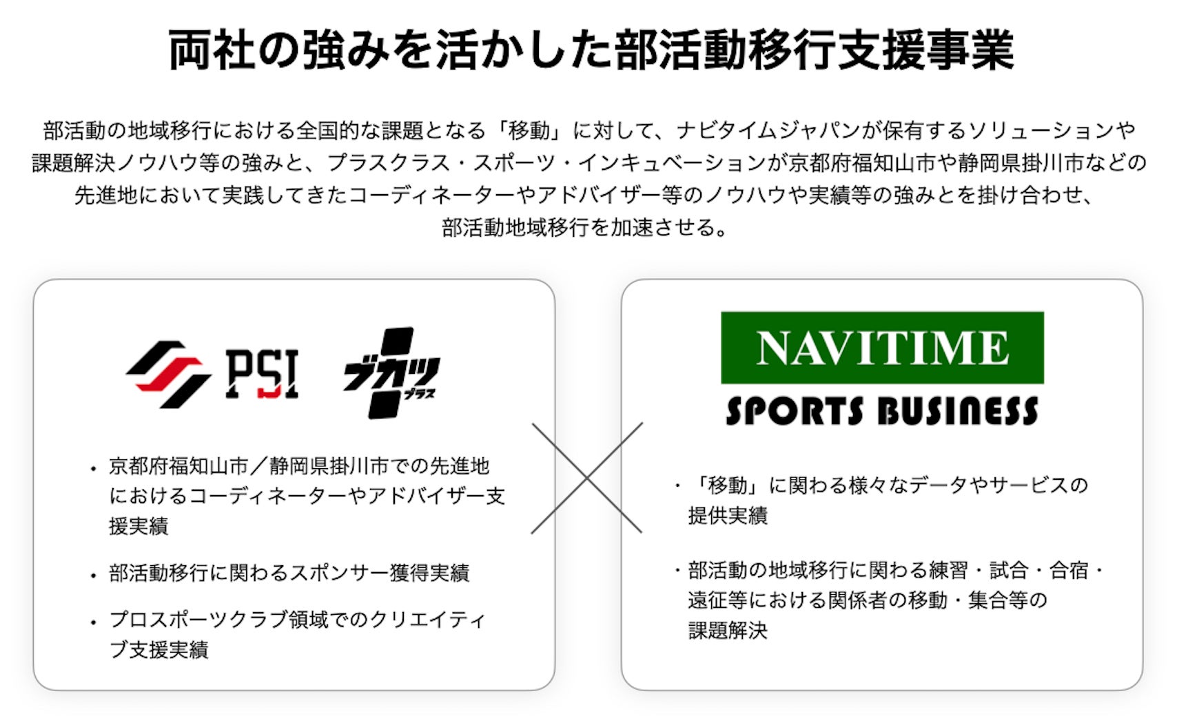 今回の連携では、プラスクラス・スポーツ・インキュベーションが提供する部活動移行事業「ブカツプラス」を利用する指導者や生徒向けに、ナビタイムジャパンの地図機能や経路検索を提供します。ナビタイムジャパンの技術とプラスクラス・スポーツ・インキュベーションが京都府福知山市や静岡県掛川市などの先進地において実践してきたコーディネーターやアドバイザー等のノウハウや実績等とを掛け合わせ、部活動の地域移行に関わる練習・試合・合宿・遠征等における、関係者の移動・集合等の課題解決に貢献します。