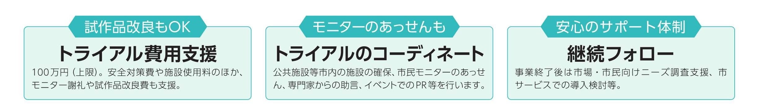 トライアルの実施に係る経費の支援(上限100万円)、実証実験会場の確保、モニターのあっせん 、イベント等でのPRの場の提供、専門家からの助言など実証実験の成果が最大限発揮されるよう必要となる調整ごとをつくば市が徹底支援します。