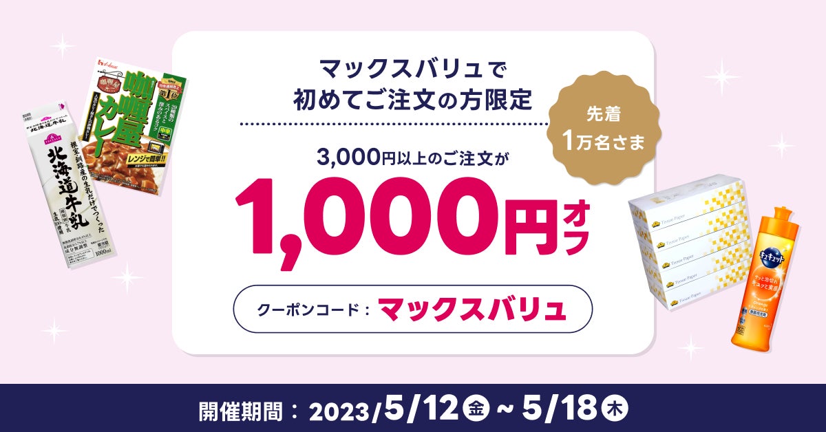 期間中、『出前館』から「マックスバリュ関東」の商品を初めてご注文される先着1万名さま限定!クーポンコード入力で3,000円以上のご注文が1,000円オフとなります。