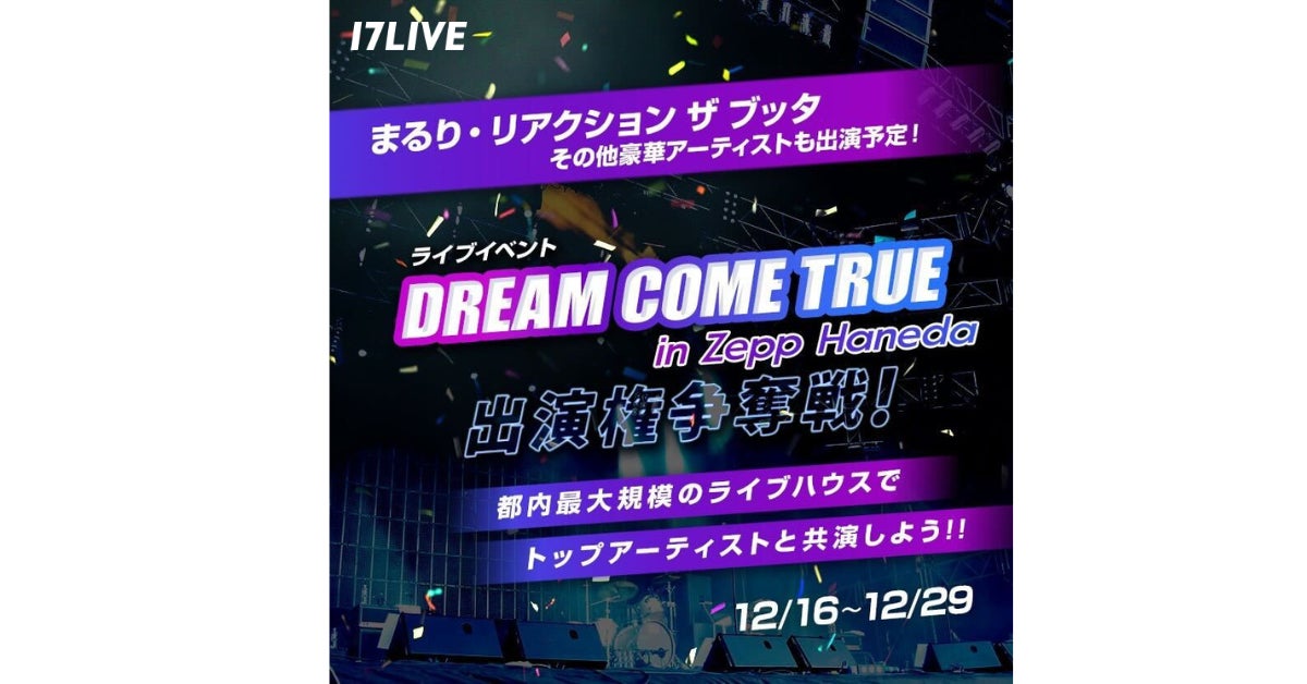 『「DREAM COME TRUE」 in Zepp Haneda 出演権争奪戦!』は、熱い想いを胸に日々活動している音楽ライバーの方々に、ライブ配信を通じて個々の夢を実現するための新たな一歩を踏み出してほしいという「17LIVE」の思いと、「DREAM COME TRUE」の夢を追いかけ続ける若者を応援するというコンセプトに共感し、実現。本オーディションイベントを通して、ライバー(ライブ配信者)が夢を叶えるキッカケの一つにしていただきたく、このたびオーディションイベントとして開催することが決定いたしました。