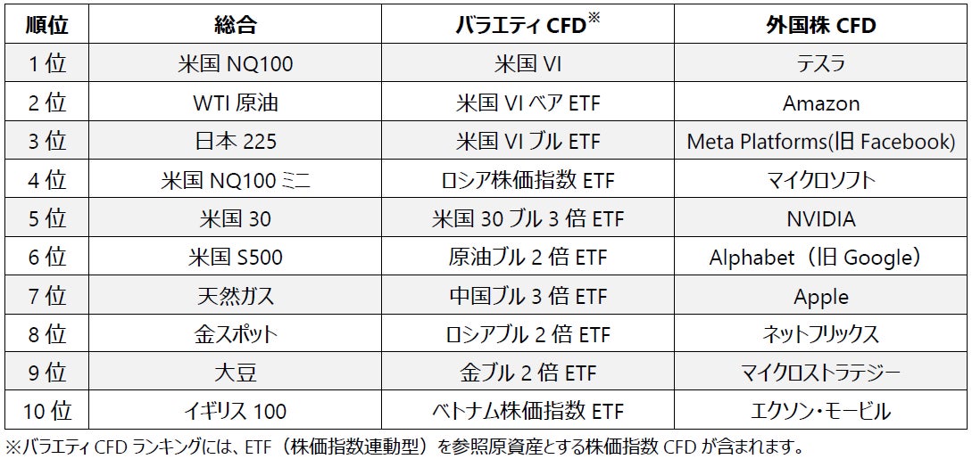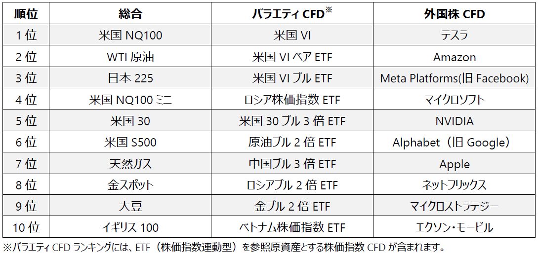 総合ランキングでは「米国NQ100」が首位となり、「WTI原油」「日本225」が続きました。バラエティCFDランキングは「米国VI」が首位、外国株CFDランキングでは「テスラ」が首位となりました。