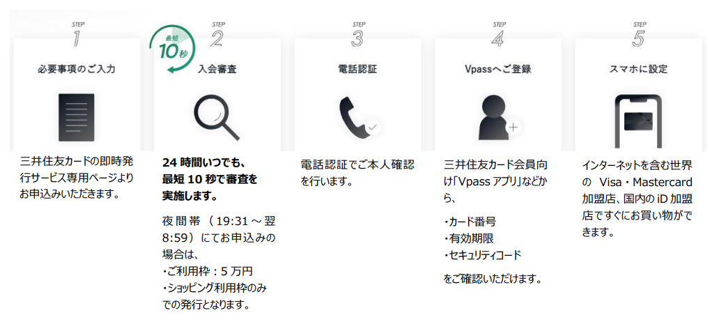 夜間帯に即時発行サービスをお申込みの場合、三井住友カードの審査処理完了まではショッピング利用枠5万円(ご利用方法は1回払いのみ)