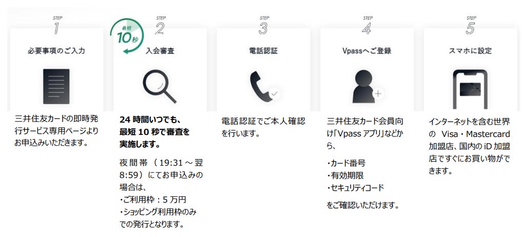 なお、夜間帯(19:31~翌8:59)にお申込みの場合、即時発行承認後のご利用枠はショッピング利用枠5万円、ご利用方法は1回払いのみとなります。夜間帯終了後、改めて三井住友カード所定の審査を行い、ショッピング利用枠の増枠や、キャッシング利用枠およびリボ払い・分割払い利用枠などを定めるほか、現物のカード発行を行います。