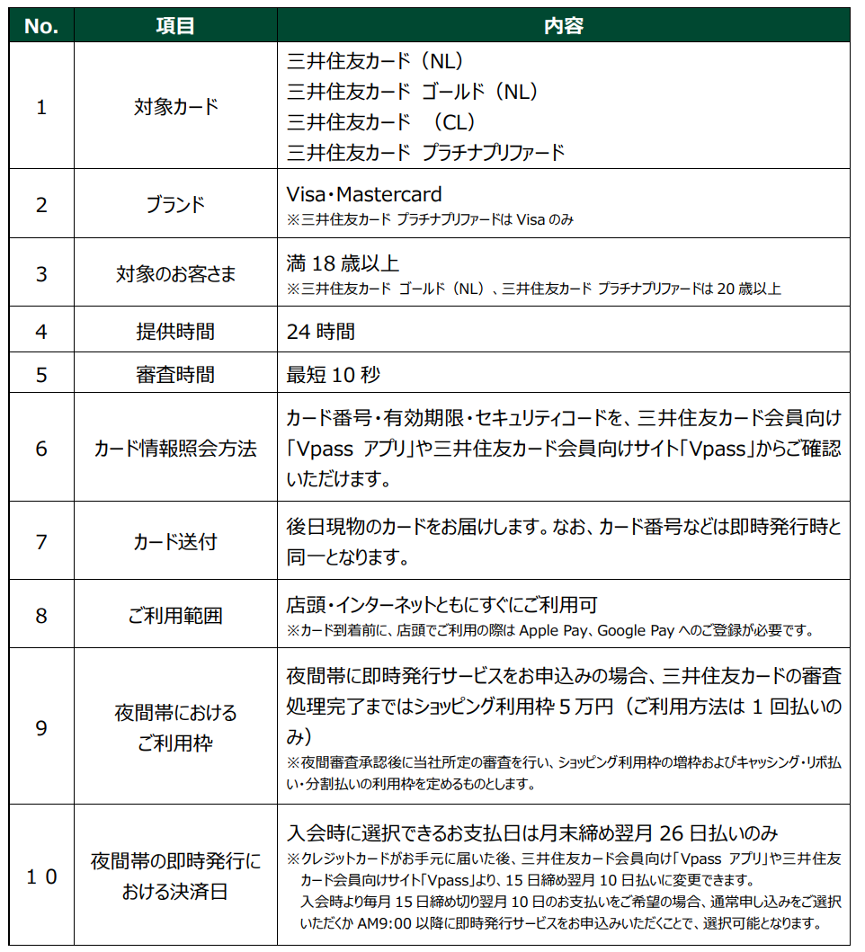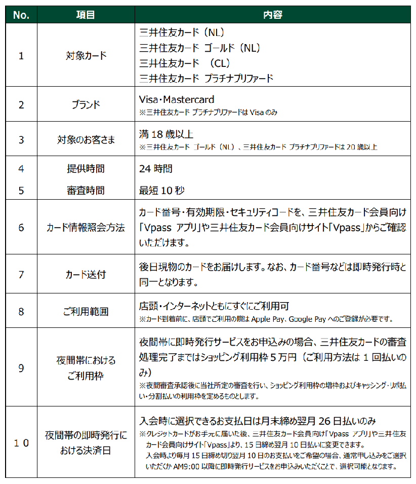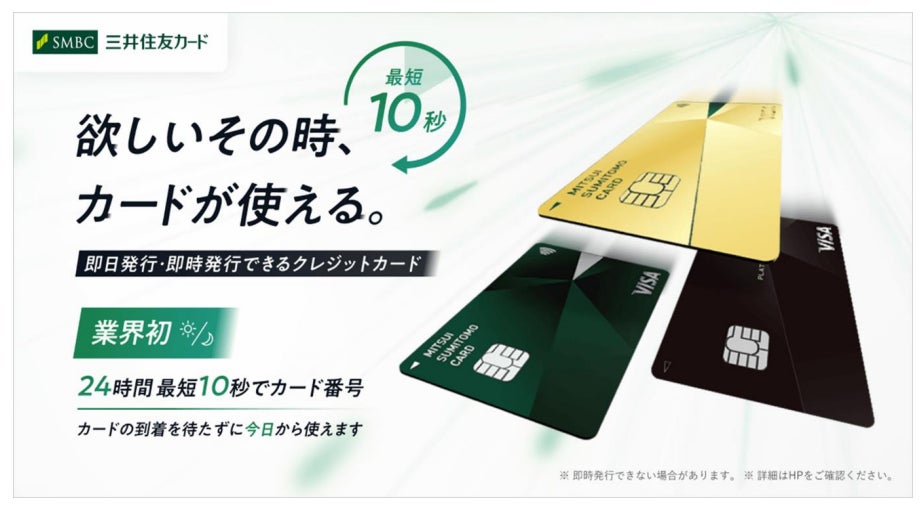 ※ システムメンテナンスなどの理由により、即時発行をご利用いただけない場合ございます。詳しくは三井住友カード ホームページよりご確認ください。