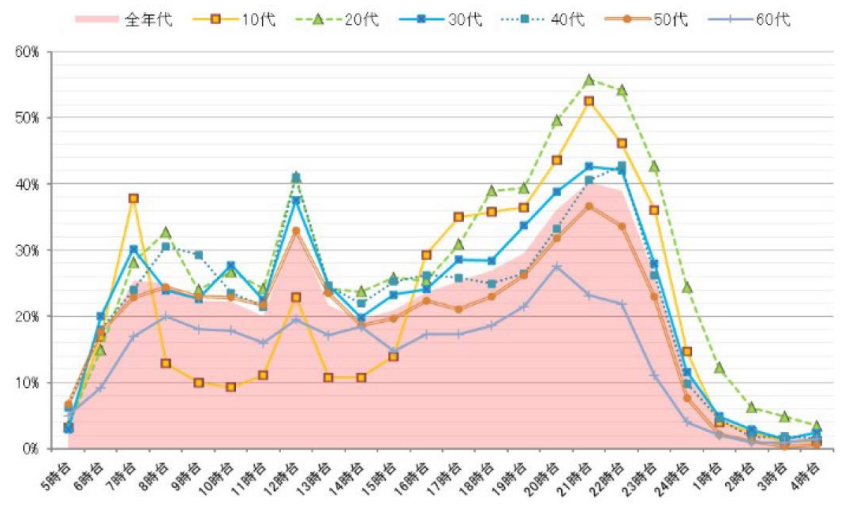 <年代別・時間帯別のインターネット利用率(平日)>