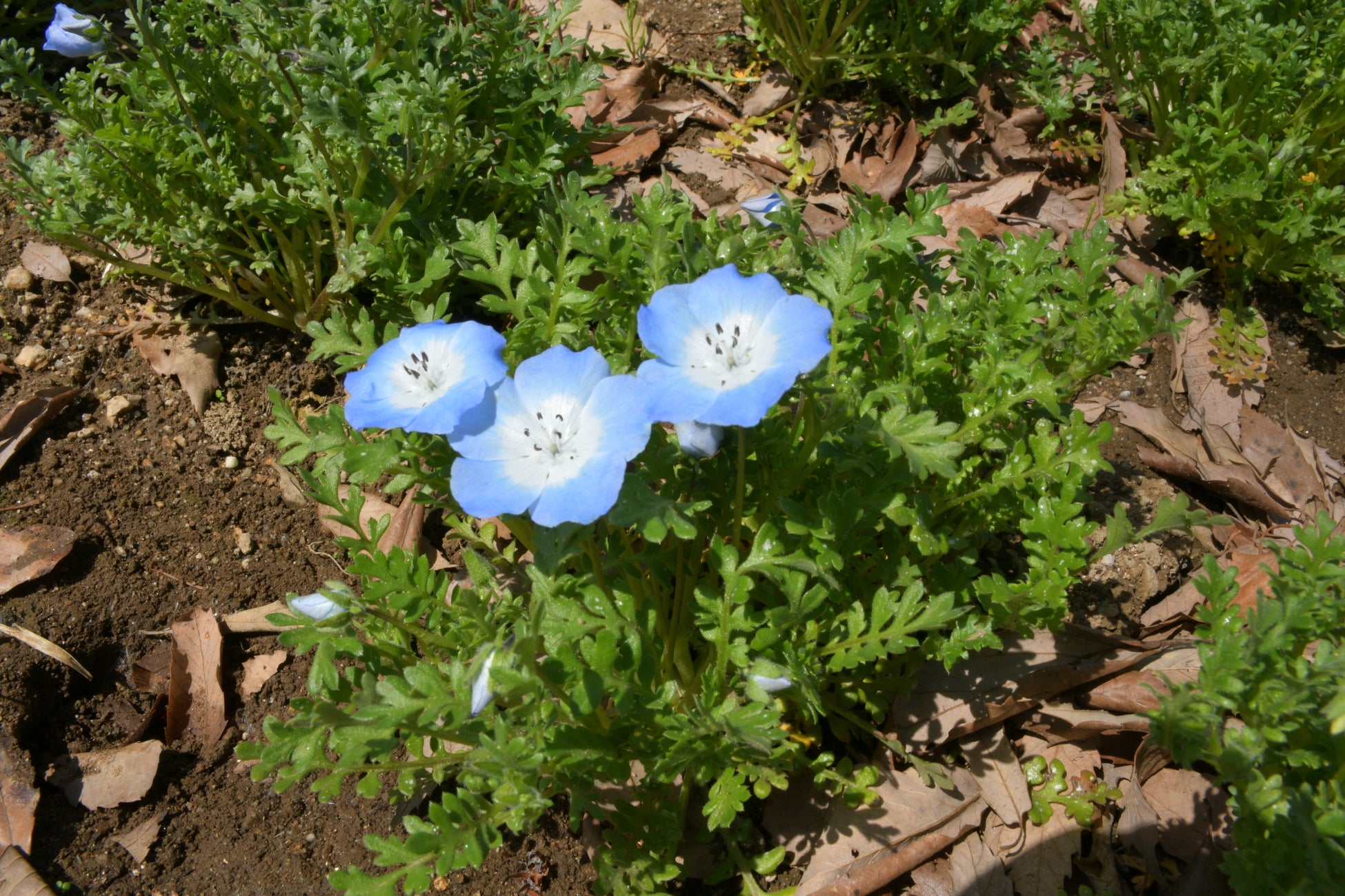 和名と、小さな青い花の中心が白いことから「Baby blue eyes」 の英名がついています。属名は「ネモス(小さな森)」と「フィレオ(愛する)」のギリシャ語から由来。 横に広がるように群生する青い花は森の中の海を想像させ、爽やかな風景が一面に広がります。