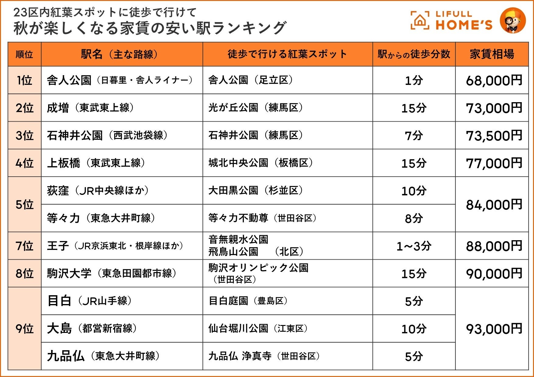 LIFULL HOME'Sが23区内の紅葉スポットに徒歩で行けて秋が楽しくなる家賃の安い駅ランキングを発表