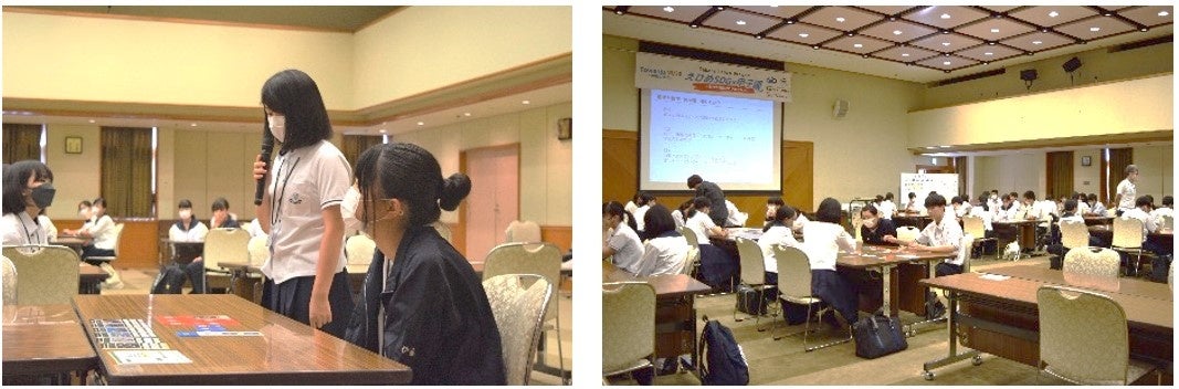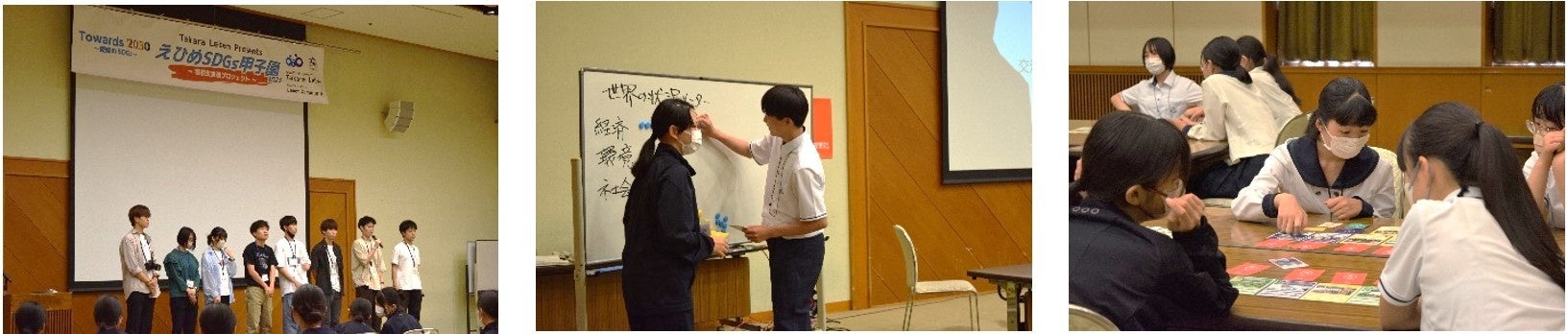 交流会では、主催者の愛媛新聞社、NPO法人 RESより開会の挨拶が行われ、企業の取り組みについての講演やチーム紹介、昨年の参加者からのアドバイスのほか、SDGsカードゲームを実施し、他校の参加者やボランティアの大学生と交流をしながら体験型の学習を行いました。