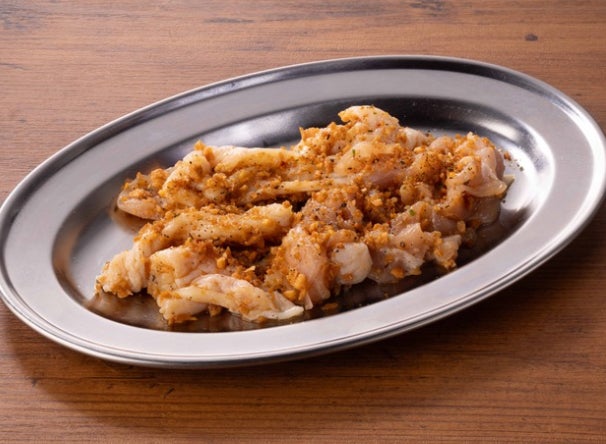 国産但馬鶏の皮とハラミにオリジナルのスパイスパウダーをまぶした一皿。