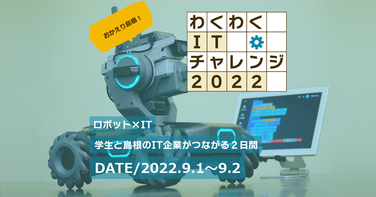 島根県は、島根県出身の大学・高専・専門学校の学生を対象に、「わくわくITチャレンジ2022 ~ロボット×ITチャレンジでつながる2日間~」を、令和4年9月1日[木]から2日[金]の2日間、島根県で開催します。