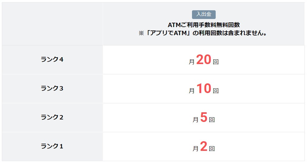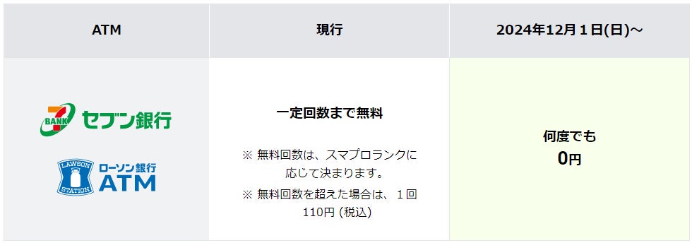 これまでは、スマートプログラムのランクに応じてATMを無料でご利用いただける回数が決まっていましたが、2024年12月1日(日)以降は「アプリでATM」でのATMご利用であれば、ランクに関わらず、いつでも何度でもATM手数料が無料となります。