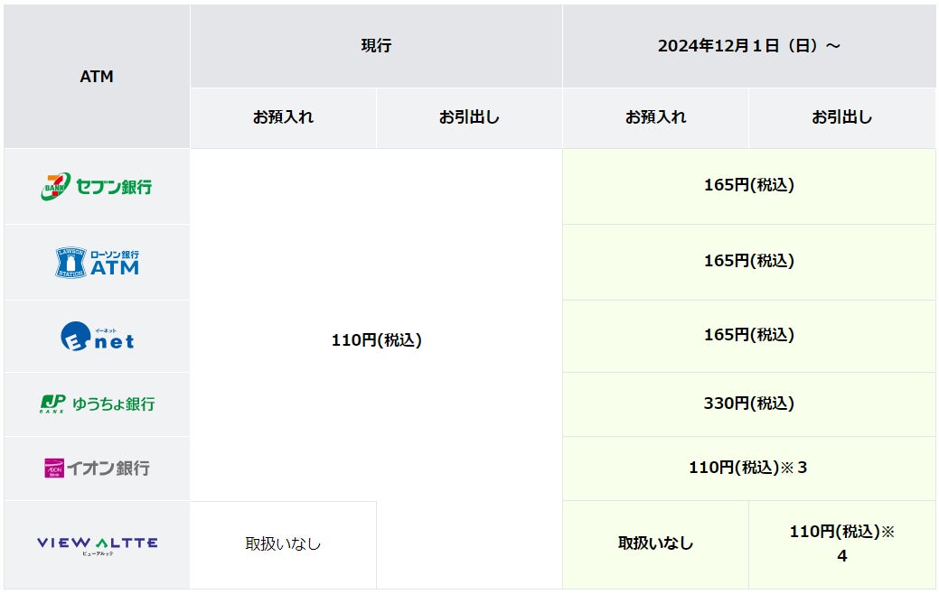 2024年12月1日(日)より、スマプロランクに応じた無料回数を超えた場合のキャッシュカードご利用時のATM手数料を、以下の通り改定いたします。