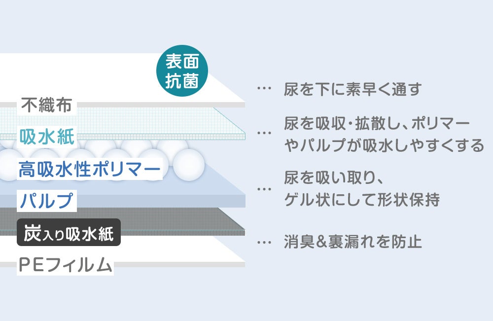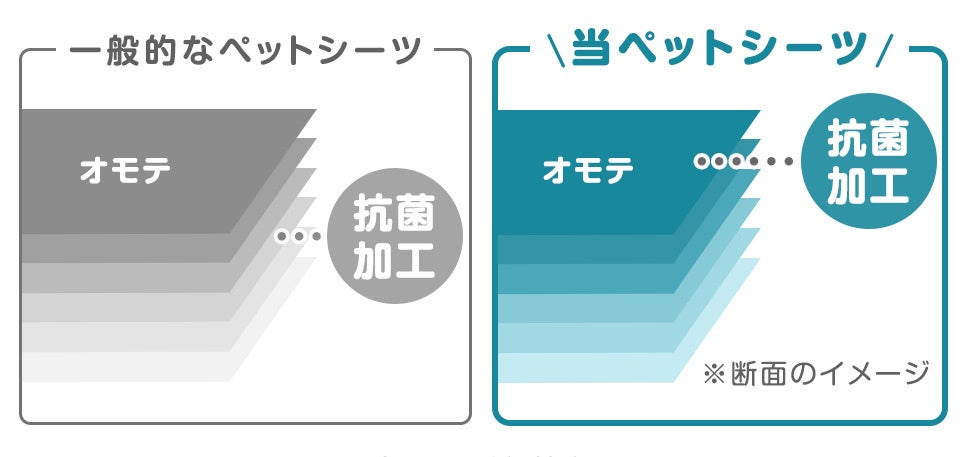 一般的なペットシーツは何層にも重なっているシートの中間部に抗菌加工を施していますが、本製品は表面に抗菌加工を施しています。それにより、排尿した瞬間から細菌の繁殖を抑えることができ、トイレを済ませたわんちゃんが排尿した部分を踏んでしまっても菌の繁殖を抑えより清潔にご使用いただくことができます。