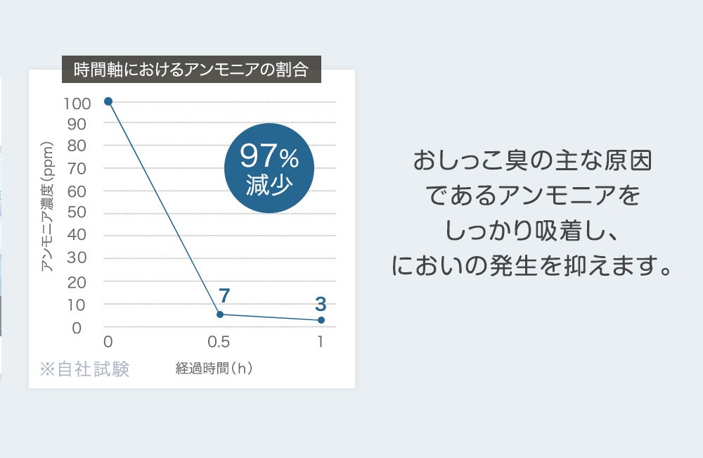 消臭力に関しては、嫌なニオイを約97%カットし、おしっこ臭の主な原因であるアンモニアをしっかり吸着し、においの発生を抑えます。