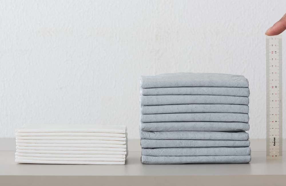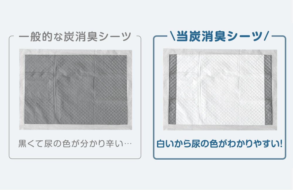 前述の通常タイプに比べ、厚手のタイプ且つ、炭繊維を配合することにより臭いを軽減する仕様になっています。こちらもレギュラーとワイドの2サイズ展開です。炭繊維を配合することにより、アンモニアなどの臭気成分を吸着し、嫌なニオイの発生を抑えます。一般的な炭を使用した消臭シーツは表面全てが黒に近いようなグレーカラーの物が多く、尿の色が分かりにくいという点がありましたが、本製品は表面のほとんどを白色にすることで炭繊維を配合していながらも尿の色がわかりやすく、ペットの健康状態をチェックしやすくなっています。