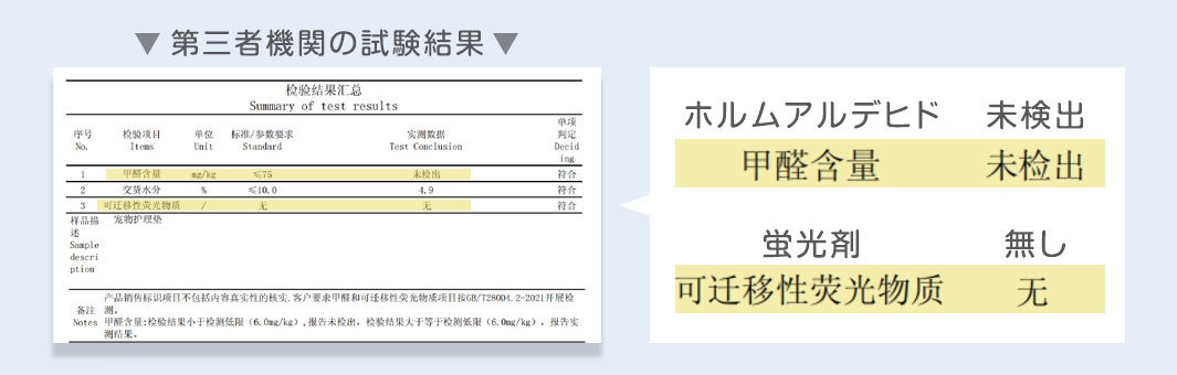 安価なペットシーツの中には蛍光剤やホルムアルデヒドが残留しているものがあり、皮膚の弱い子やアレルギーのある子にとっては刺激の原因となることもありますが本製品は安心してご使用いただけるように第三者機関での試験を実施しどちらも未検出と安全にご使用いただけるように徹底してこだわっています。