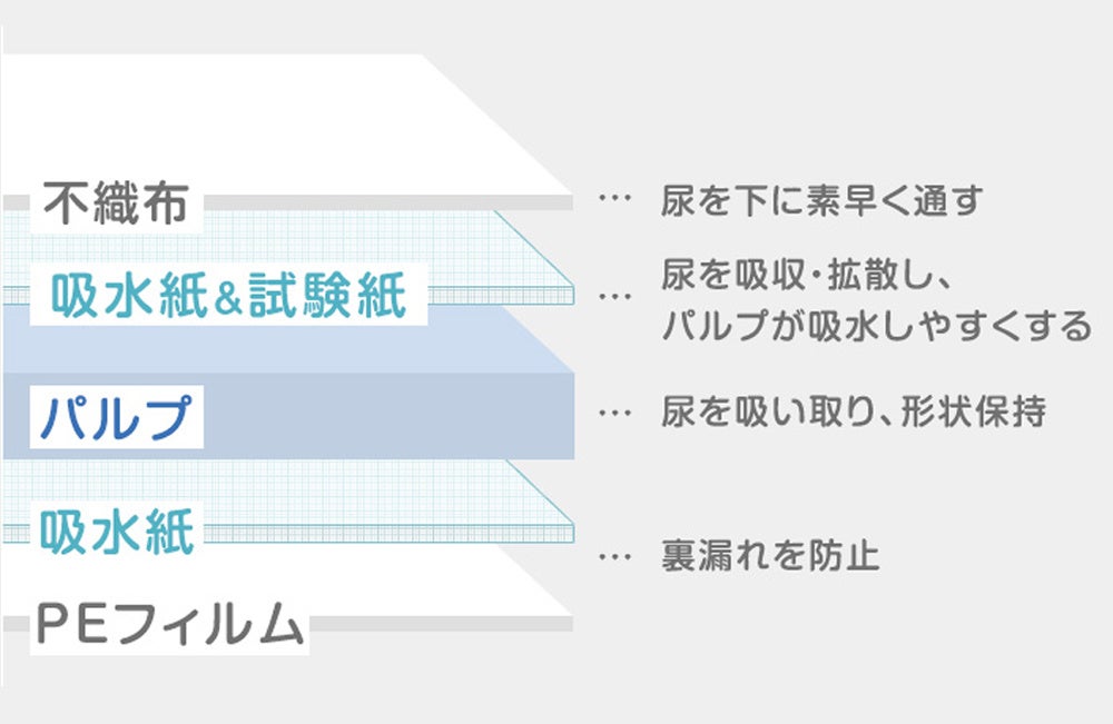 本製品は5層構造となっており、通常タイプ、炭入り消臭タイプと違いポリマーを使用していませんがパルプを多めに使用することで吸収率もしっかり確保しています。健康状態のチェックだけでなく、しっかりとおしっこを吸収する仕様でわんちゃんも飼い主さんも安心してご使用いただけます。
