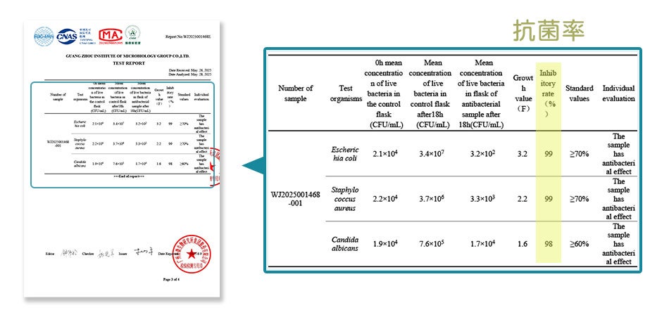 抗菌加工に関しては、第三者機関で、感染症の原因となりやすい菌について抗菌試験を実施しており、大腸菌、黄色ブドウ球菌に対し99%、ガンジダ・アルビカンスに対し98%と高い抗菌率を示しました。
