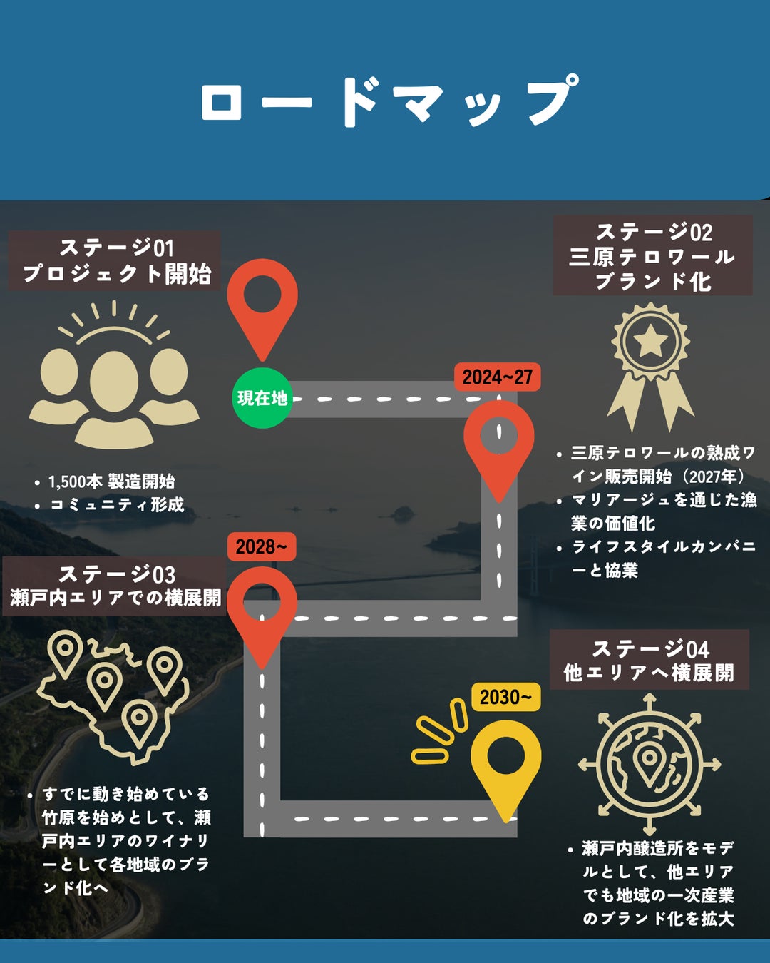 本プロジェクトでは、瀬戸内醸造所株式会社が自社施設・自社圃場・多くの契約生産者を有する広島県三原市で“瀬戸内テロワールのブランド化”に取り組み、地域の一次産業の価値を視覚化してきたモデルを活用します。三原市から竹原市など瀬戸内の周辺エリアや日本の各地域へ展開し、各地域での一次産業ブランド化を目指していきます。