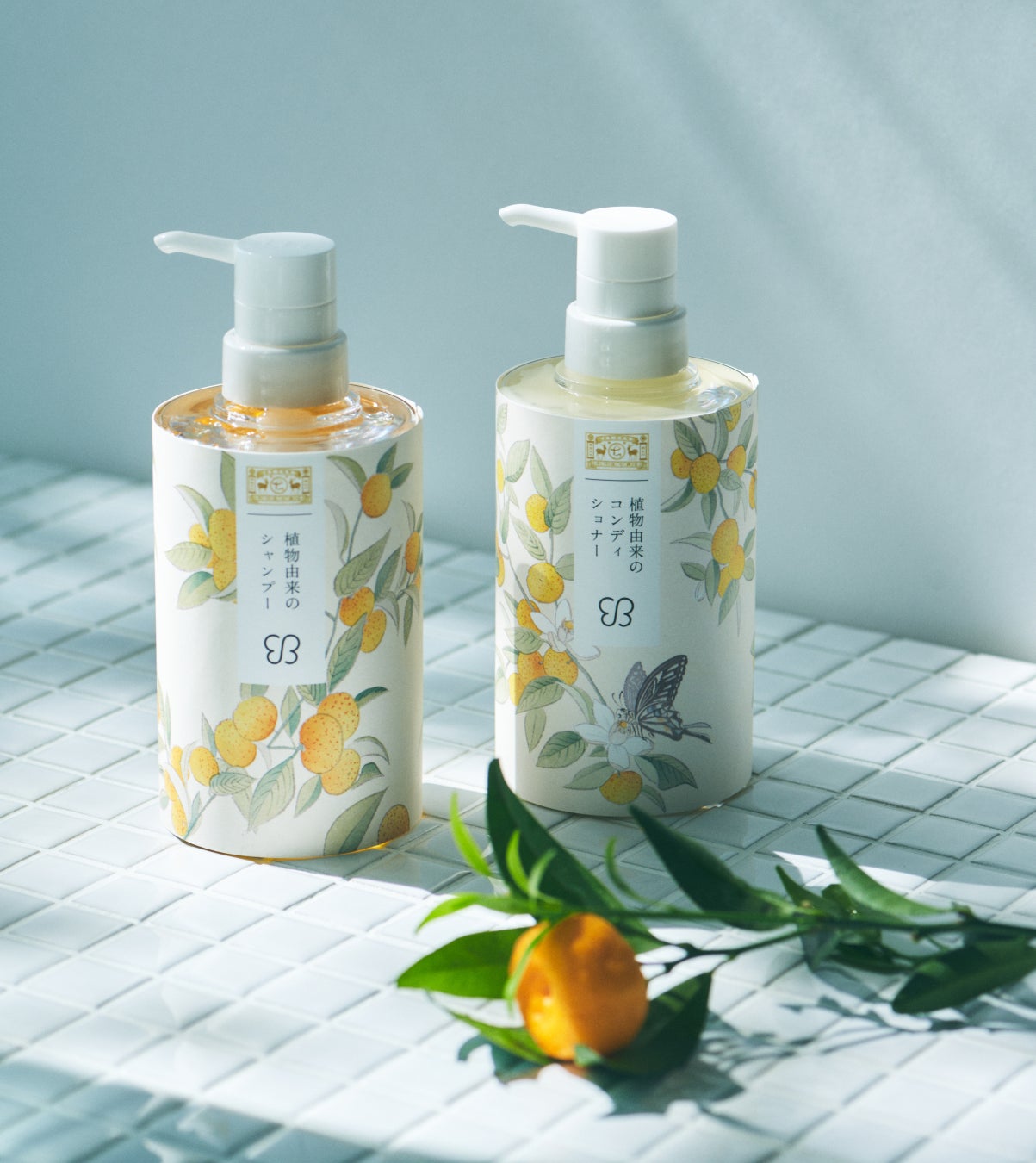 奈良に育つその希少な実を蒸留した「タチバナ果実水」20%を、シャンプー・トリートメントの香りに配合しました。もぎたてのようにフレッシュで青く清々しい香り、柑橘らしい鼻を抜けるような爽やかな香りが溶けあい、清らかで凛とした香気がバスルームを包みます。