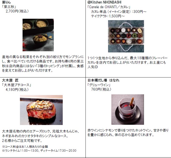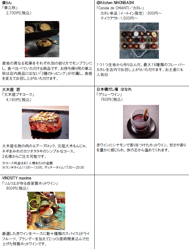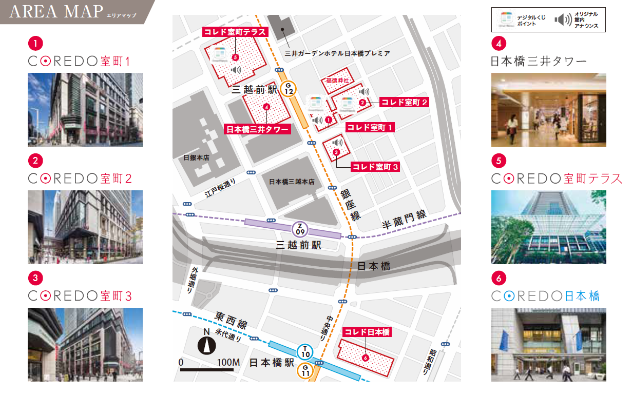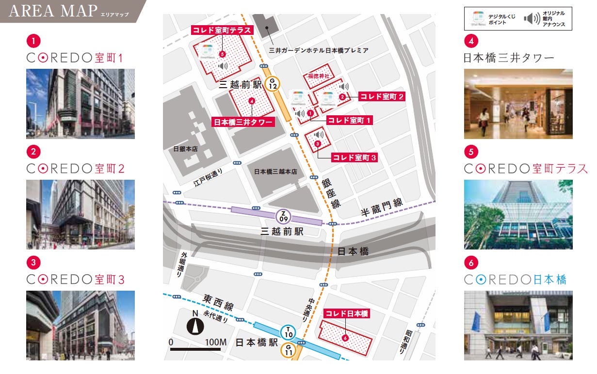 | 施設HP | ●コレド室町テラス、コレド室町1・2・3 https://mitsui-shopping-park.com/urban/muromachi/ ●コレド日本橋 https://mitsui-shopping-park.com/urban/nihonbashi/index.html |