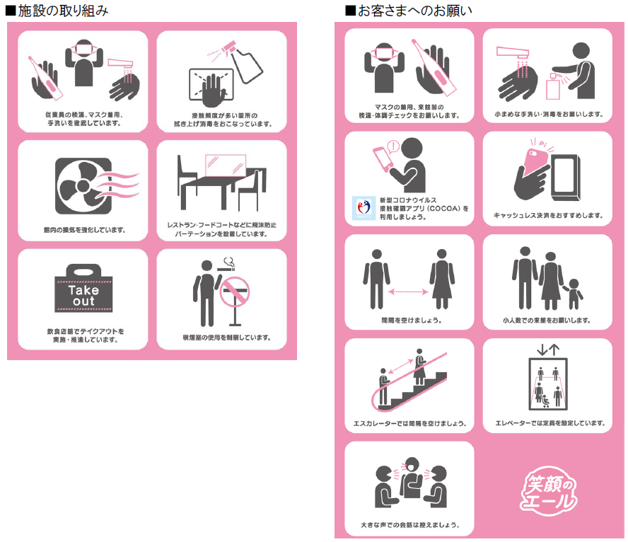 三井不動産グループが運営する商業施設では、新型コロナウイルス感染拡大防止のため下記をはじめとした様々な取り組みを実施しております。