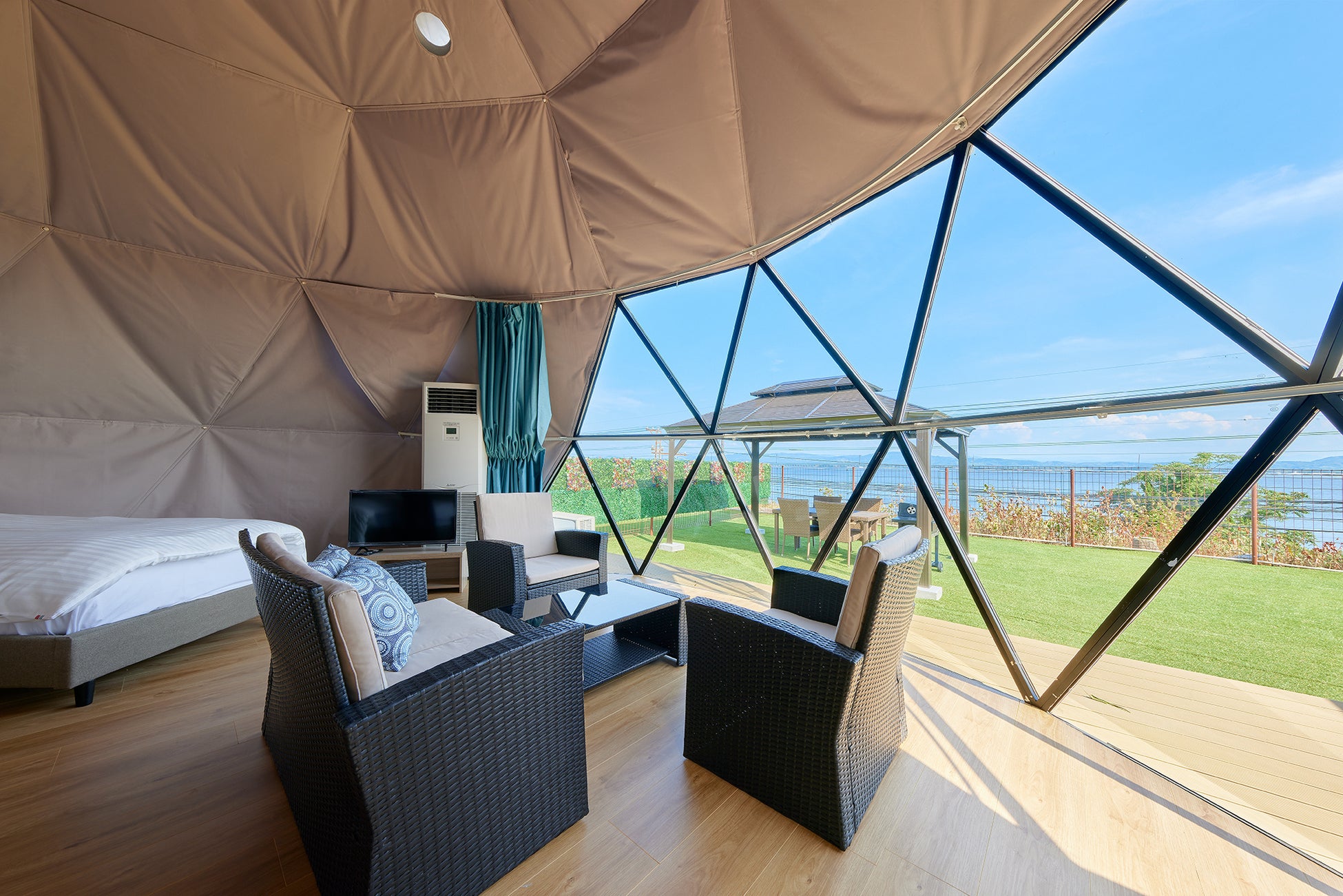 絶景の宍道湖を望む高台に大型のドームテントを5棟配置。