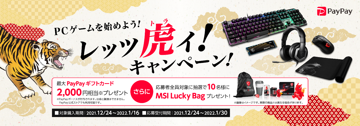 この度、エムエスアイコンピュータージャパン株式会社は、2021年12月24日(金)から2022年1月16日(日)までの期間で、対象の製品をご購入いただいた先着200名様に最大2,000円分のPayPayギフトカードをプレゼントする「PCゲームを始めよう!レッツ虎イ!キャンペーン」を開催いたします。