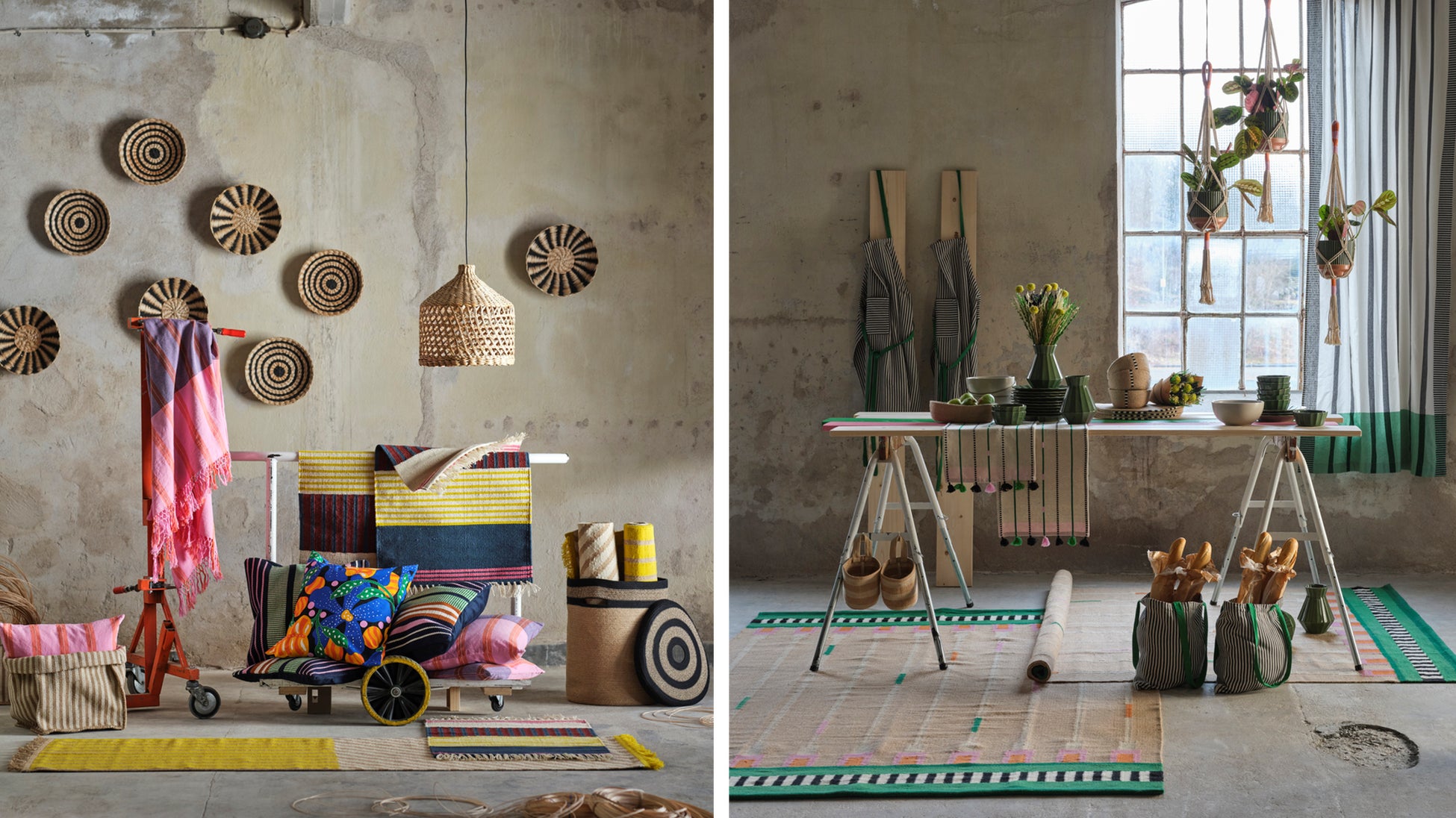 本コレクションは、スカンジナビアモダンのデザインを天然素材で表現し、緑や黄色のアクセント、ストライプ柄、大胆な花柄プリントなど、伝統的な要素と現代的な美しさを融合させた特徴的なアイテムが揃っています。このコレクションは、イケアが社会的に弱い立場にある人々への長期的な雇用機会と持続可能な生計手段の提供を目指した取り組みの一環として、デザイナーのLuna GilとMaria Vinkaが、世界各地の9つのソーシャルビジネスと協力して手掛けたものです。
