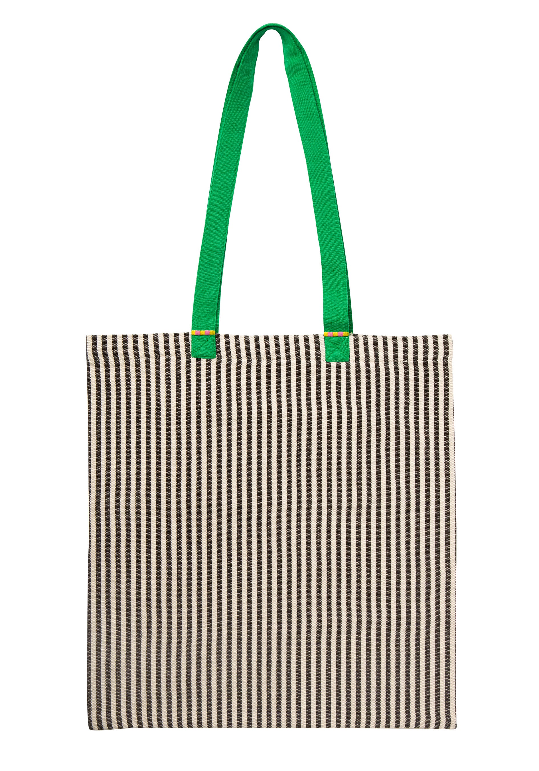 白黒ストライプのトートバッグは、手織りの綿糸で作られ、鮮やかなグリーンの持ち手がアクセントです。持ち手部分の刺繍がテクスチャーを加え、デザイン性を高めています。ノートパソコンやお弁当箱が入る十分なサイズで、買い物などに便利です。内側にはフラップ付きポケットがあり、小物の整理に役立ちます。