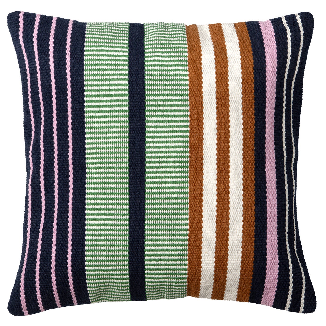 手織りのストライプが特徴のクッションカバーは、素朴ながらも、モダンな洗練された印象です。 熟練した職人の技や、色彩と形のコントラストが目を引きます。