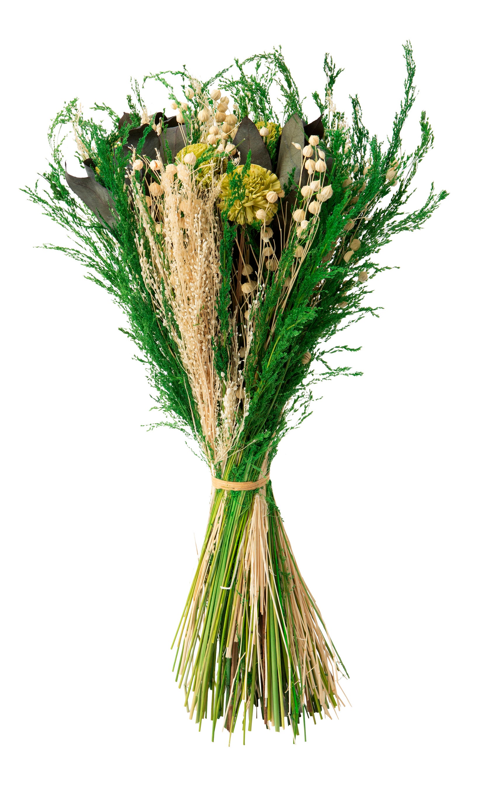 自然素材で家を飾りましょう。 ホワイトや明るいグリーンのドライプラントのブーケは、窓辺に飾っても、ダイニングテーブルに飾ってもステキです。鮮やかな色や美しさを何年も楽しめます。また、このブーケは茎を分けて使い、新しい小さなアレンジメントをつくって家のいろんなコーナーに飾ることもできます。