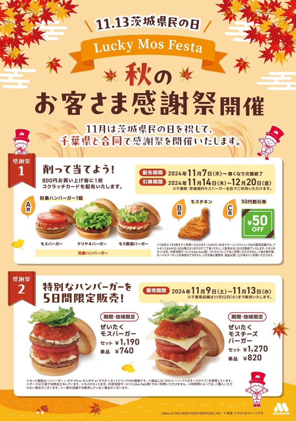 モスバーガーを展開する株式会社モスフードサービス(代表取締役社長:中村 栄輔、本社:東京都品川区)では、茨城県と千葉県のモスバーガー全77店舗で、茨城県民の日※1(11月13日)を記念して「Lucky Mos Festa ~秋のお客さま感謝祭~」を期間限定で開催します。11月7日(木)から商品引換などができるスクラッチカード企画を実施するとともに、特別限定商品の『ぜいたくモスバーガー』(740円)と『ぜいたくモスチーズバーガー』(820円)を11月9日(土)~11月13日(水)の5日間限定※2で販売します。