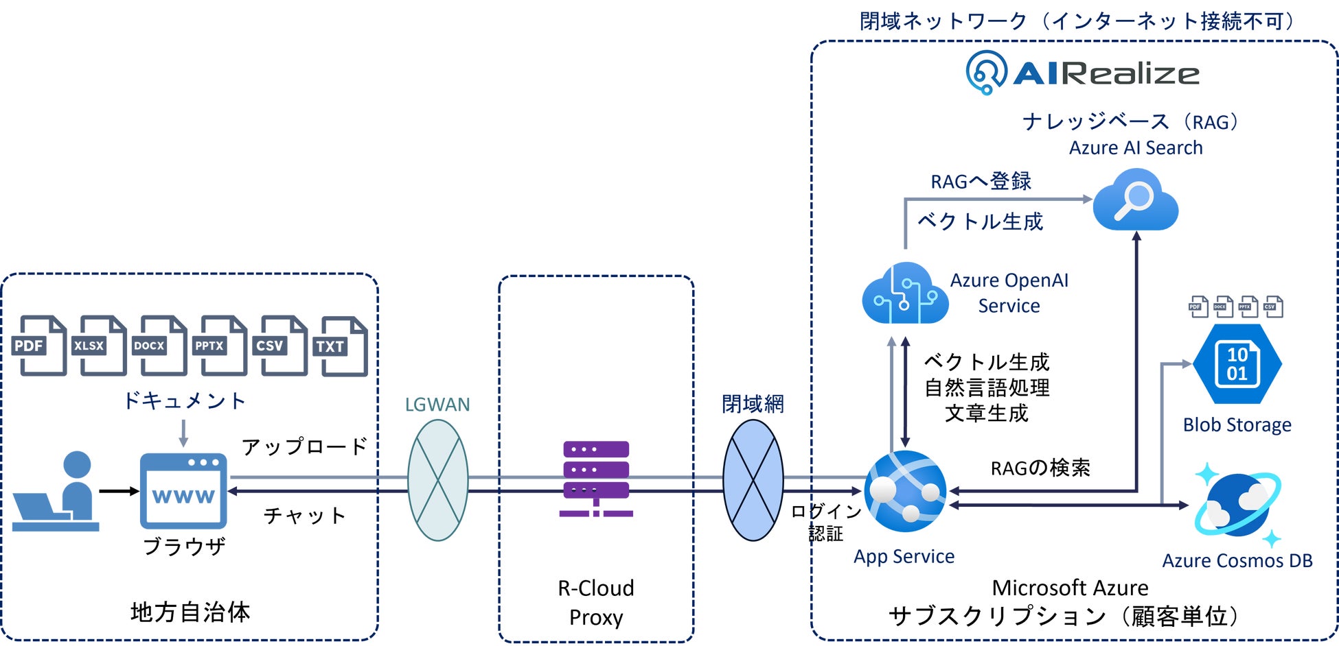 このような自治体が抱える課題を解決するため、アライズはLGWAN環境から生成AIの利用が可能な「AIRealize on LGWAN」の提供を開始します。本サービスは、自治体のための高度なセキュリティを維持しながら、全庁的なAI技術の活用を可能にし、自治体の業務効率化を支援します。