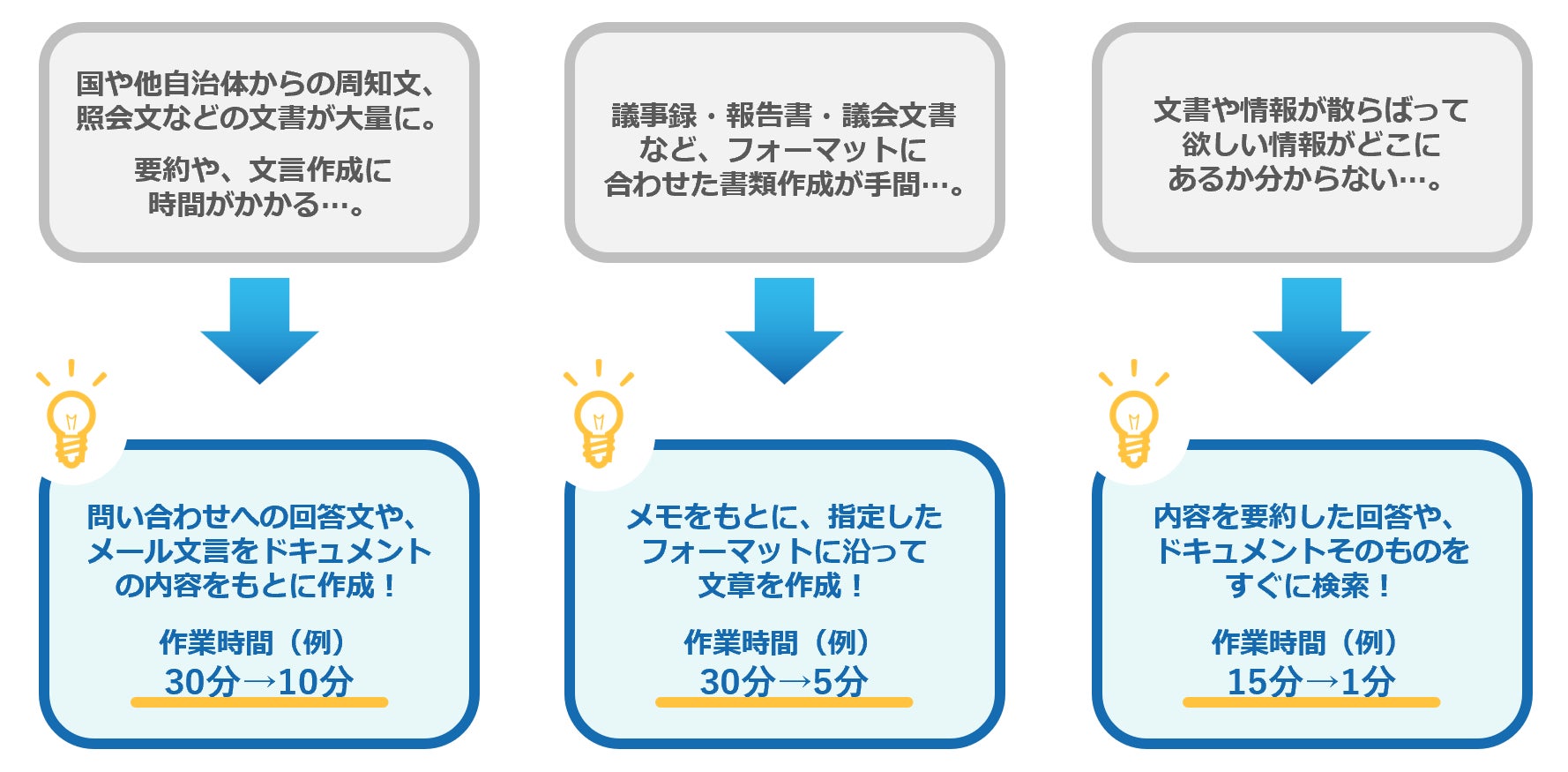 フォーマットに基づいた文書作成、多言語対応、ドキュメント検索、データ分析、問い合わせ対応などの業務にかかる作業時間を大幅に削減します。職員の業務負担を軽減することで、政策立案や複雑な案件への対応など、より専門性の高い業務に注力できるようになり、行政サービスの迅速化と品質向上の促進を実現します。 -