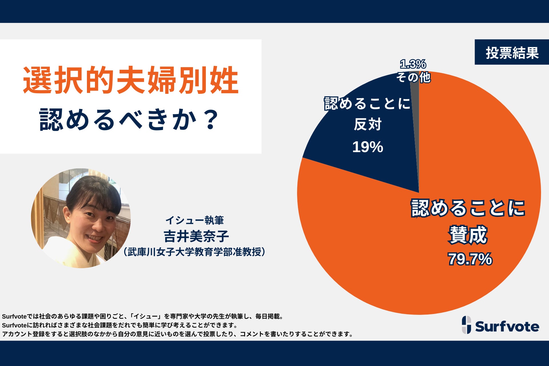 武庫川女子大学教育学部准教授の吉井美奈子氏がSurfvoteで課題提起。婚姻した夫婦が同姓になることは本当に伝統で、唯一の正解なのか?投票結果について吉井氏からのコメントも掲載。