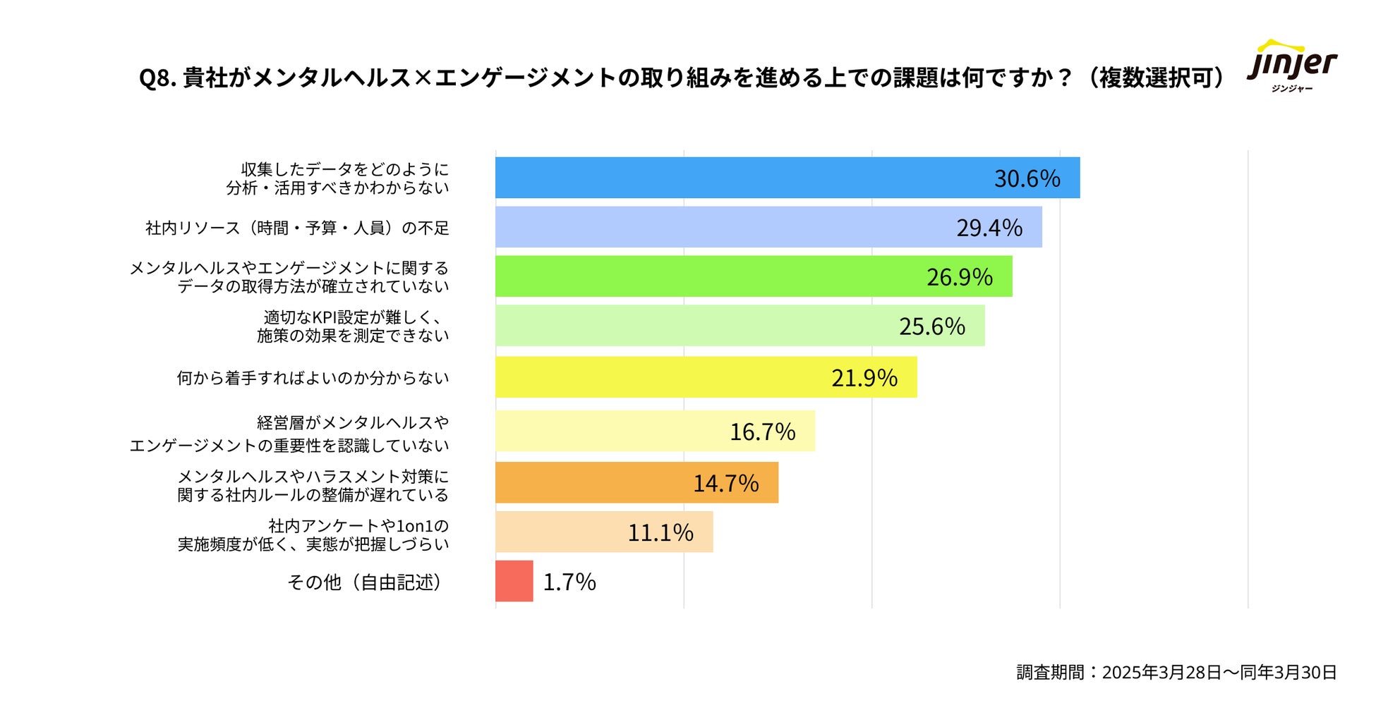 メンタルヘルス×エンゲージメントの取り組みを進める上での課題は、「収集したデータをどのように分析・活用すべきかわからない」が最多