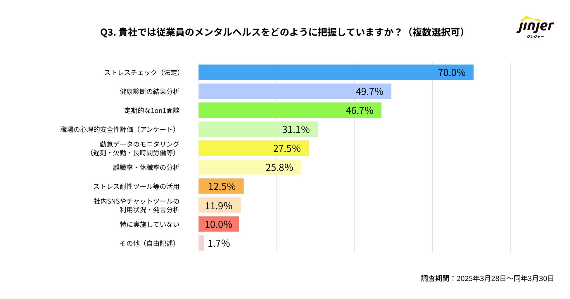 従業員のメンタルヘルスの把握方法は、「ストレスチェック(法定)」が最多