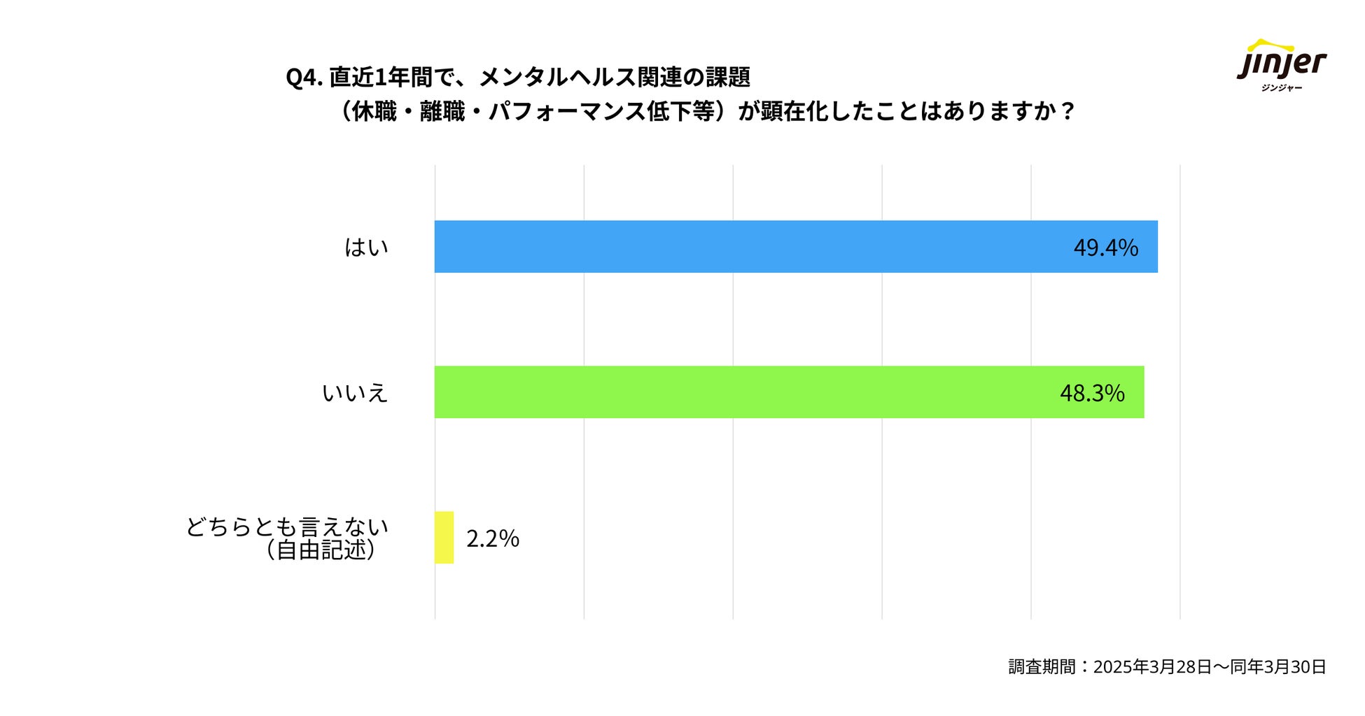 メンタルヘルス関連の課題(休職・離職など)が顕在化している企業は、約半数存在