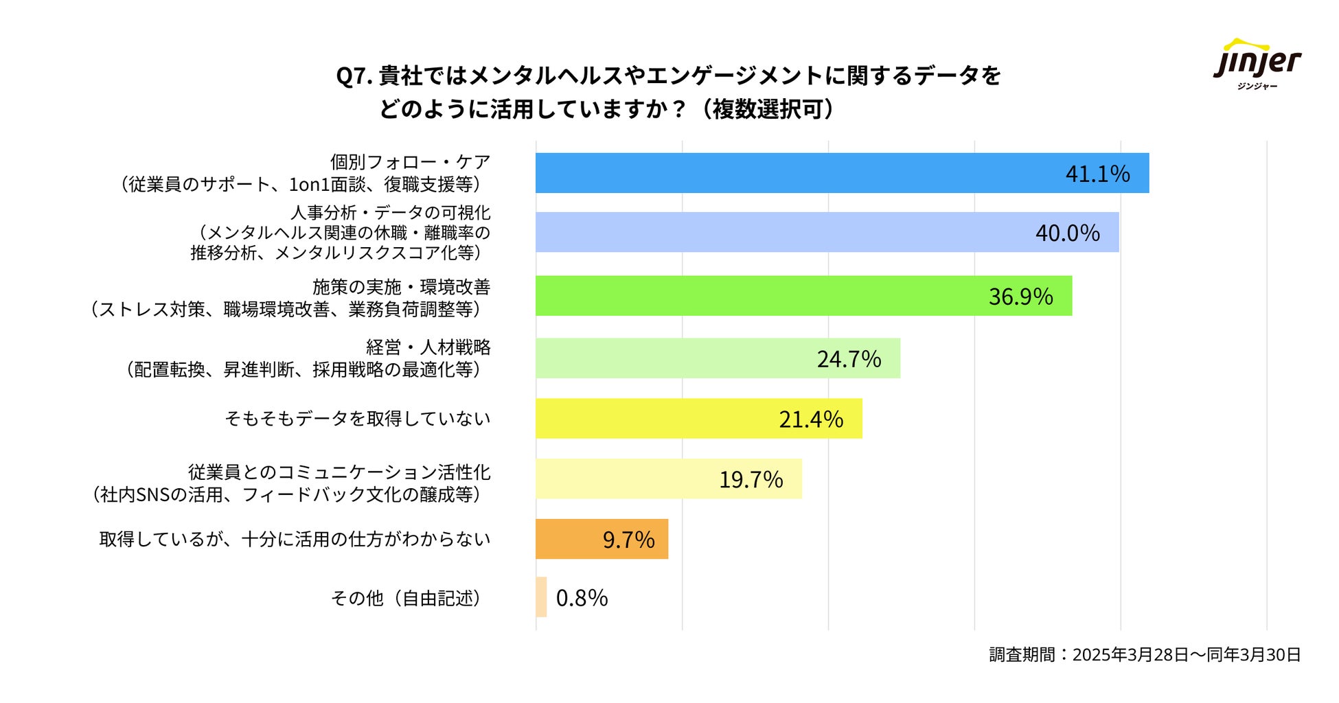 メンタルヘルスやエンゲージメントに関するデータの活用方法は、「個別フォロー・ケア(従業員のサポート・1on1)」が最も多い意見としてあげられました。次いで「人事分析・データの可視化(メンタルヘルス関連の休職・離職率の推移分析等)」、「施策の実施・環境改善(ストレス対策、職場環境改善)」、「経営・人材戦略(配置転換、昇進判断、採用戦略の最低帰化等)」という結果でした。