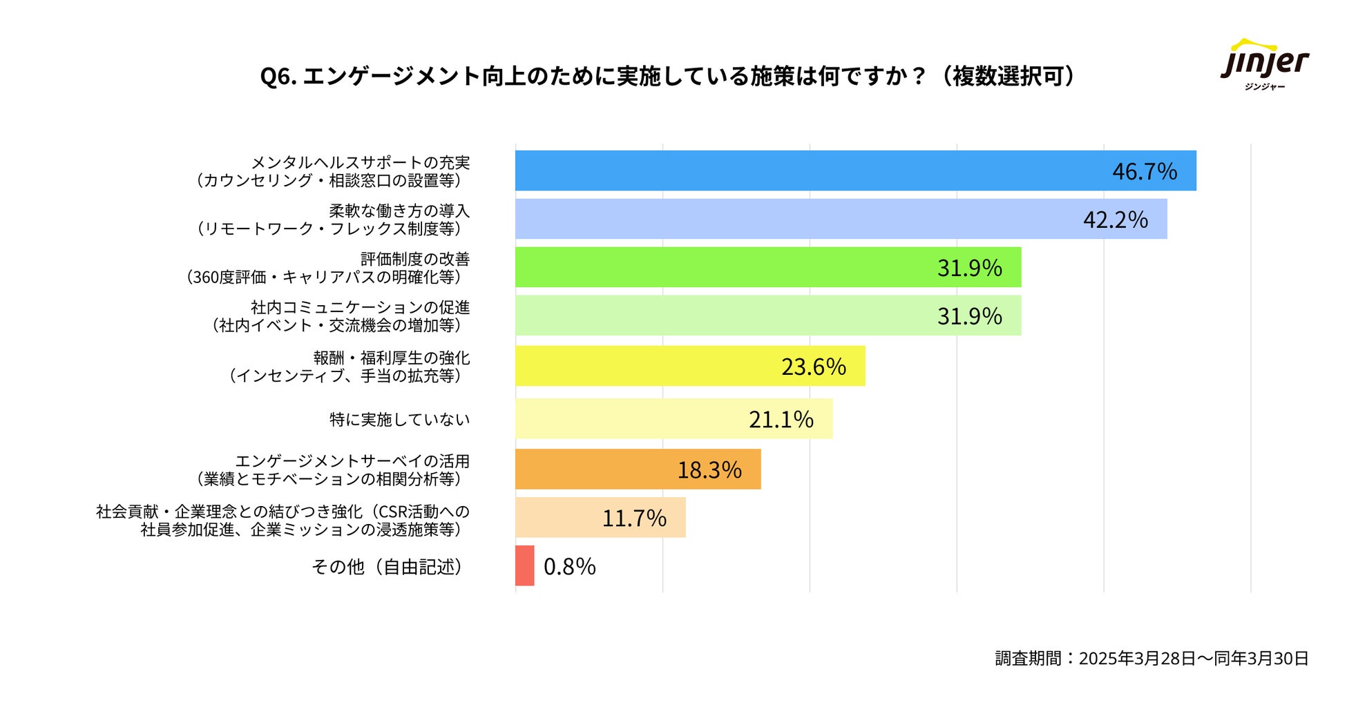 エンゲージメント向上のために実施中の施策は、「メンタルヘルスサポートの充実」が最多