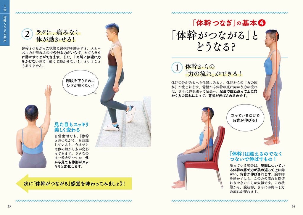 体幹がつながると、「立っているだけで背骨が伸びる」「長時間立っていても座っていても疲れない」「痛みなくラクに体を動かすことができる」「体のクセや歪みがなくなる」「体形がスッキリして美しくなる」という変化が体に起こります。また、無理な動きがないので日常の習慣にしやすく、ラクで美しい体が年齢に関係なく定着します。