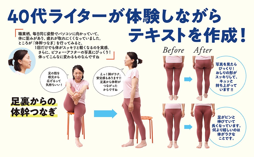 「体幹つなぎ」とはどういうものなのかを知るために、40代ライターが、事前練習なしで、自ら体を張って数々のメソッドに挑戦。動きや体の変化を実際に感じながら執筆しました。ビフォー・アフターのあきらかな体の変化も見比べることができます。
