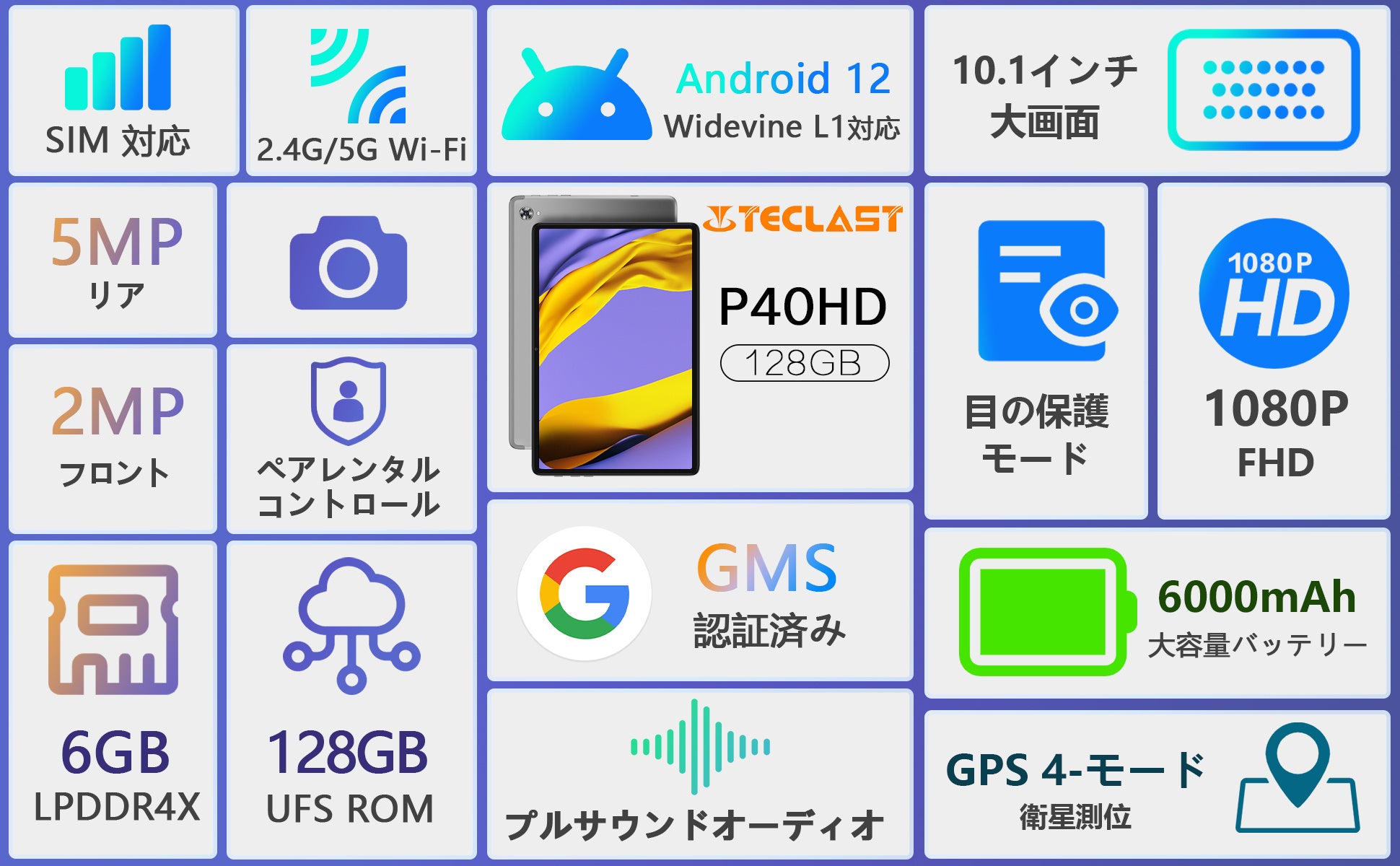 P40HD android タブレットは、大容量6GBのRAMと、128GB容量のストレージを搭載しています。更に、最大1TB TFカード(FAT32形式、別売り)の容量拡張に対応し、ほとんどの主流アプリの高速処理に満足できます。2023年アップグレード版P40HDは、Widevine L1対応です。動画を最高画質で見ることができます。注):Netflix HD 動画再生には対応していません。タブレットは、GoogleのGMS認証に合格しています。安定したスムーズな Google サービスを体験してください。