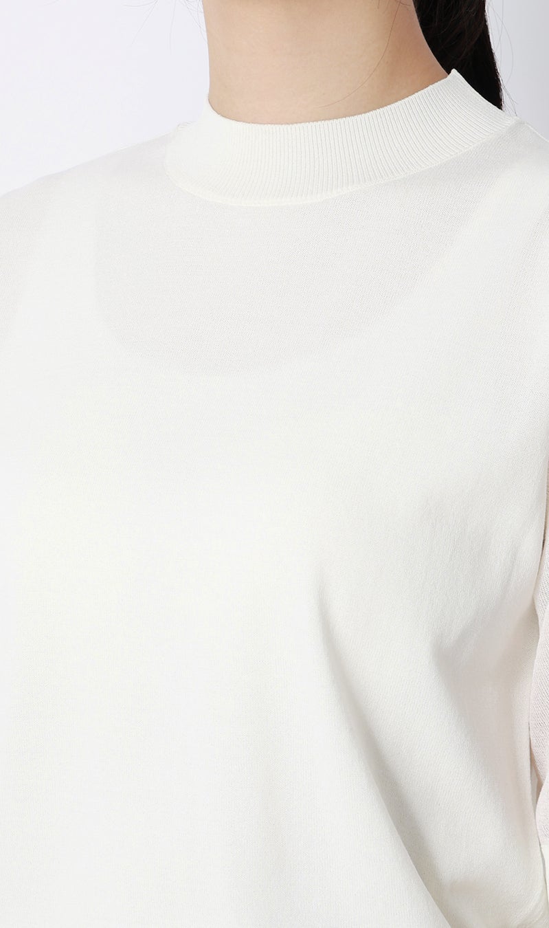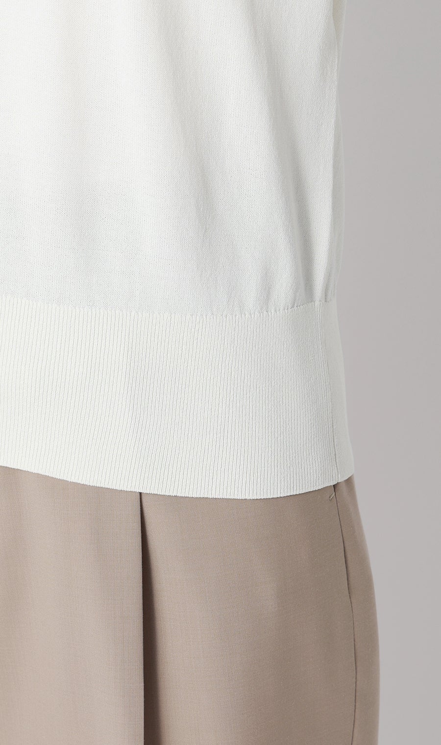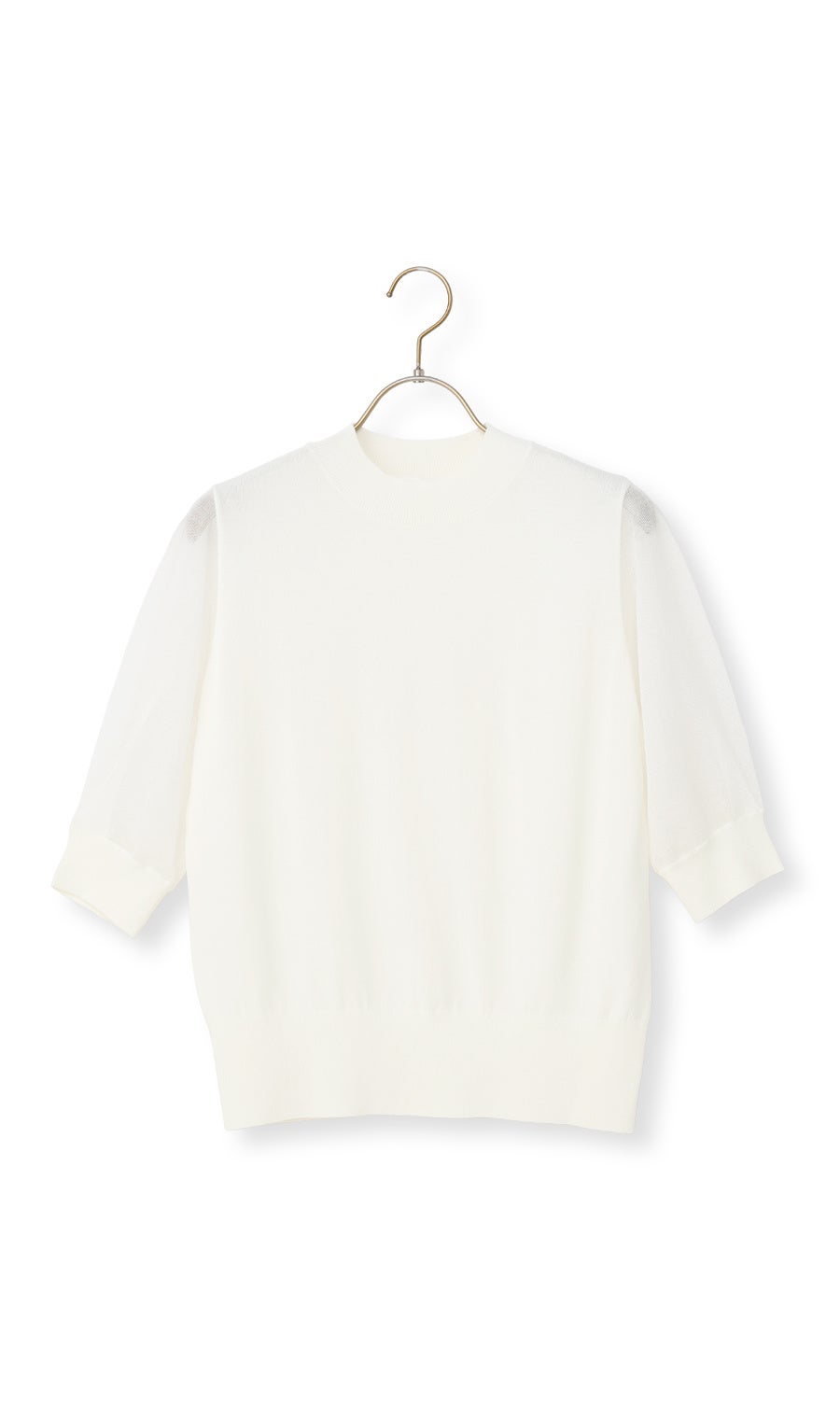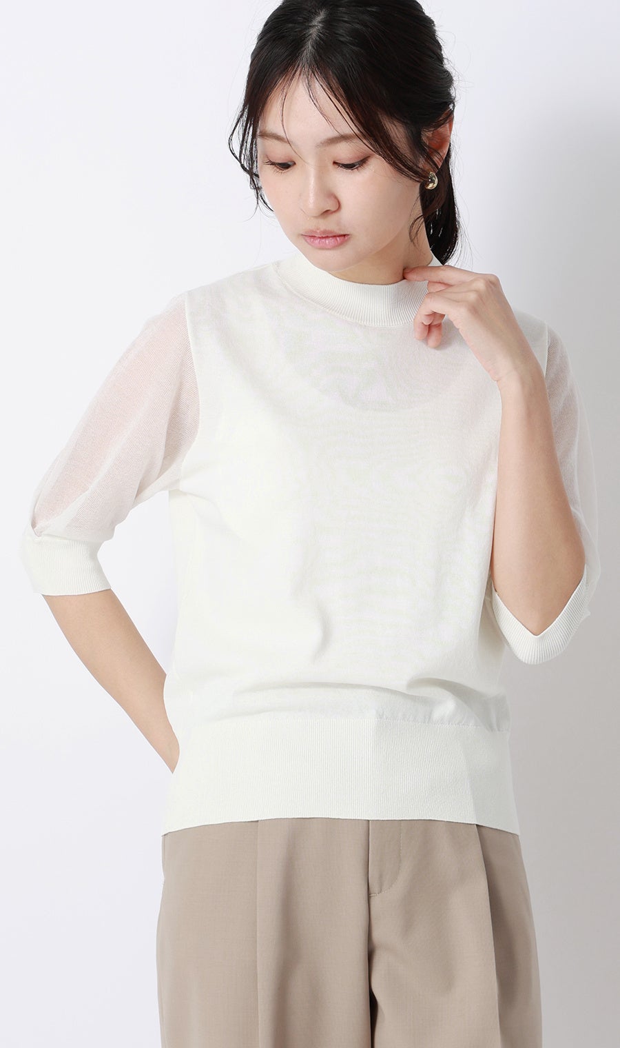 本商品の身頃部分は、細い糸を高密度に編み立てることで表面の凹凸を抑え、滑らかで柔らかな肌触りに仕上げています。デザインは、気になる二の腕をさりげなく隠せる5分袖に加え、襟元は少し詰まり気味のハイネック仕様にすることで、首周りをすっきり見せつつきちんとした印象に。さらに、自宅の洗濯機で洗えるマシンウォッシャブルや、毛玉になりにくい抗ピリング素材を採用しているため、イージーケア性にも優れています。暑い夏に向けて、気軽にトレンドを取り入れながら一枚でも透けを気にせず着用できるアイテムです。