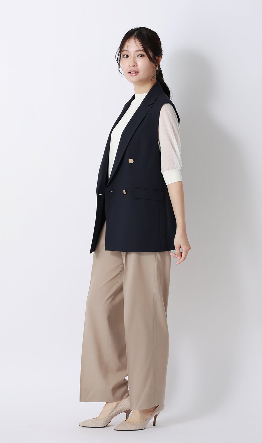レディースファッションにおけるシアー素材のアイテムは、視覚的な涼しさや、上品な肌見せでこなれ感を演出できる商品として注目を集めています。その一方で、アウターとしての重ね着を前提とすることが多いため、「色や肌見せの加減に悩む」「インナーの選択が難しい」といった、トレンドを取り入れたいものの気軽に着用しにくい一面があります。そこで今回、身頃は透けさせずに袖部分のみシアー素材を使用したニットを企画。一枚でも安心して着用でき、トレンドの「抜け感」とビジネスシーンに必須の「きちんと感」を両立しました。